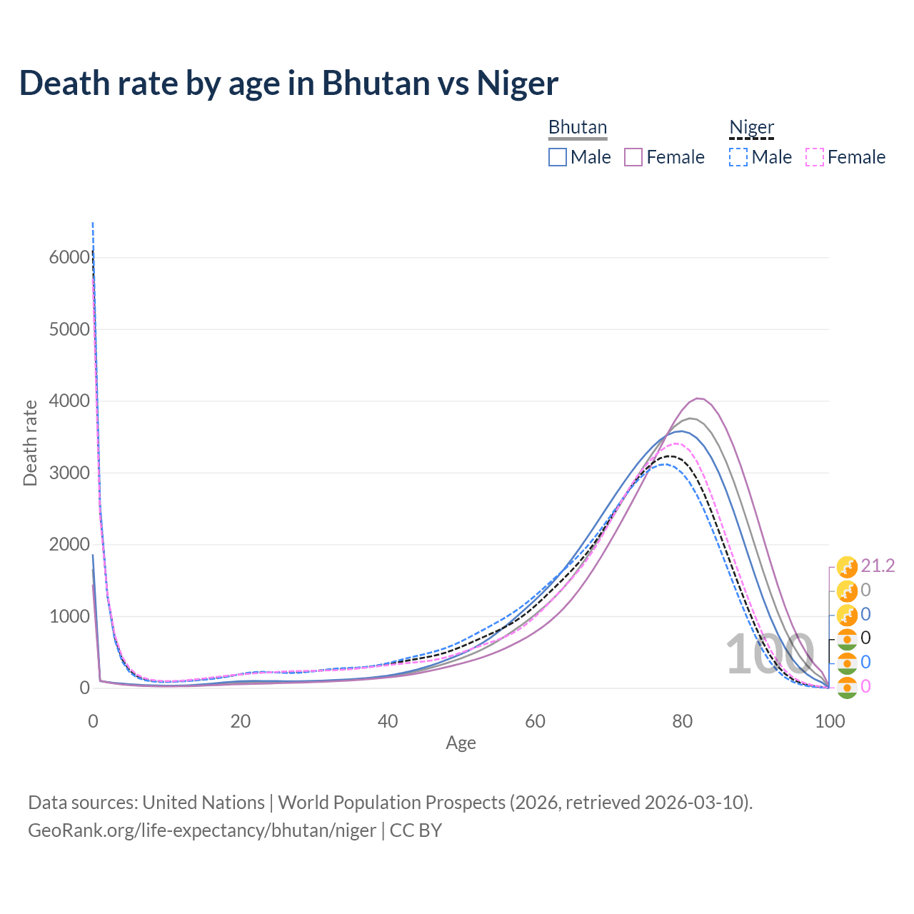 In Bhutan, the most common age of death is 81, compared to 0 in Niger. The median age of death is 77.6 in Bhutan and 71.7 in Niger, meaning only half of each cohort is expected to live past that age.
