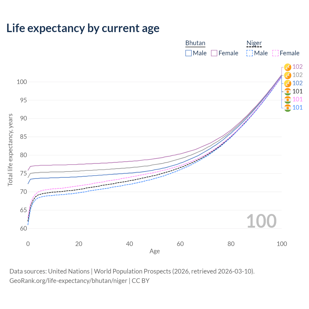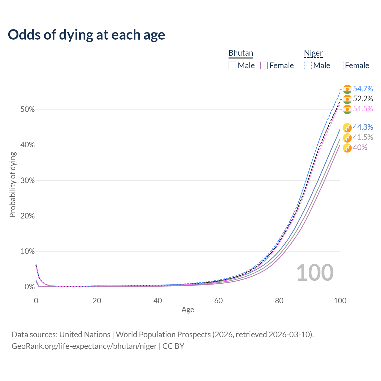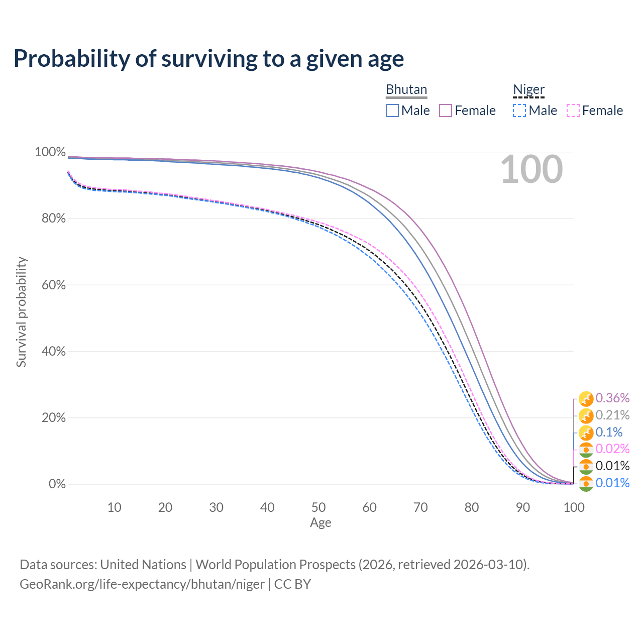 This life expectancy calculator shows the odds of living to 100, 95, 90, and below based on current age for both males and females in Bhutan and Niger, along with mean and median age of death. The calculations are based on the 2026 life tables (actuarial tables) from the UN World Population Prospects.