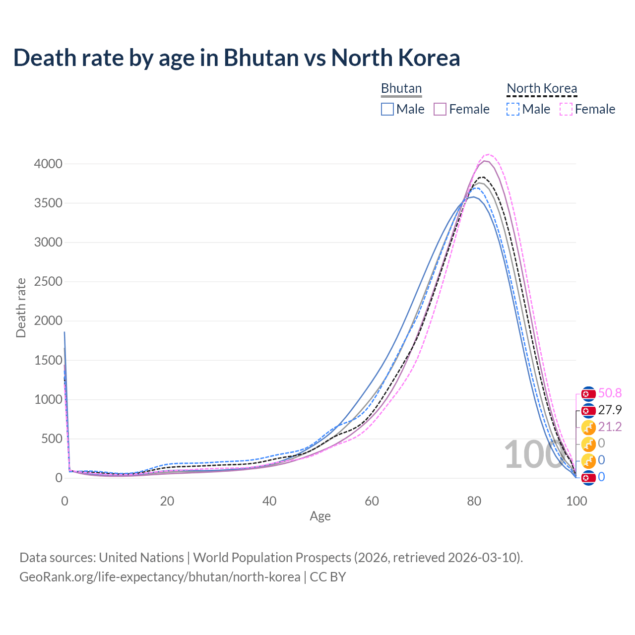 This life expectancy calculator shows the odds of living to 100, 95, 90, and below based on current age for both males and females in Bhutan and North Korea, along with mean and median age of death. The calculations are based on the 2026 life tables (actuarial tables) from the UN World Population Prospects.