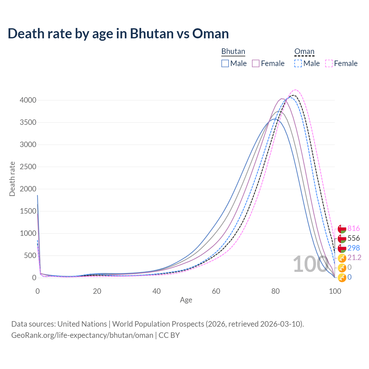 In Bhutan, the most common age of death is 81, compared to 86 in Oman. The median age of death is 77.6 in Bhutan and 83.5 in Oman, meaning only half of each cohort is expected to live past that age.