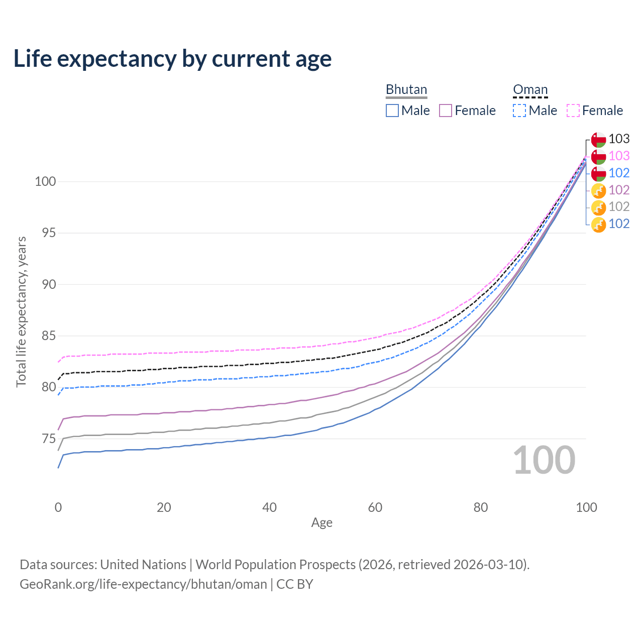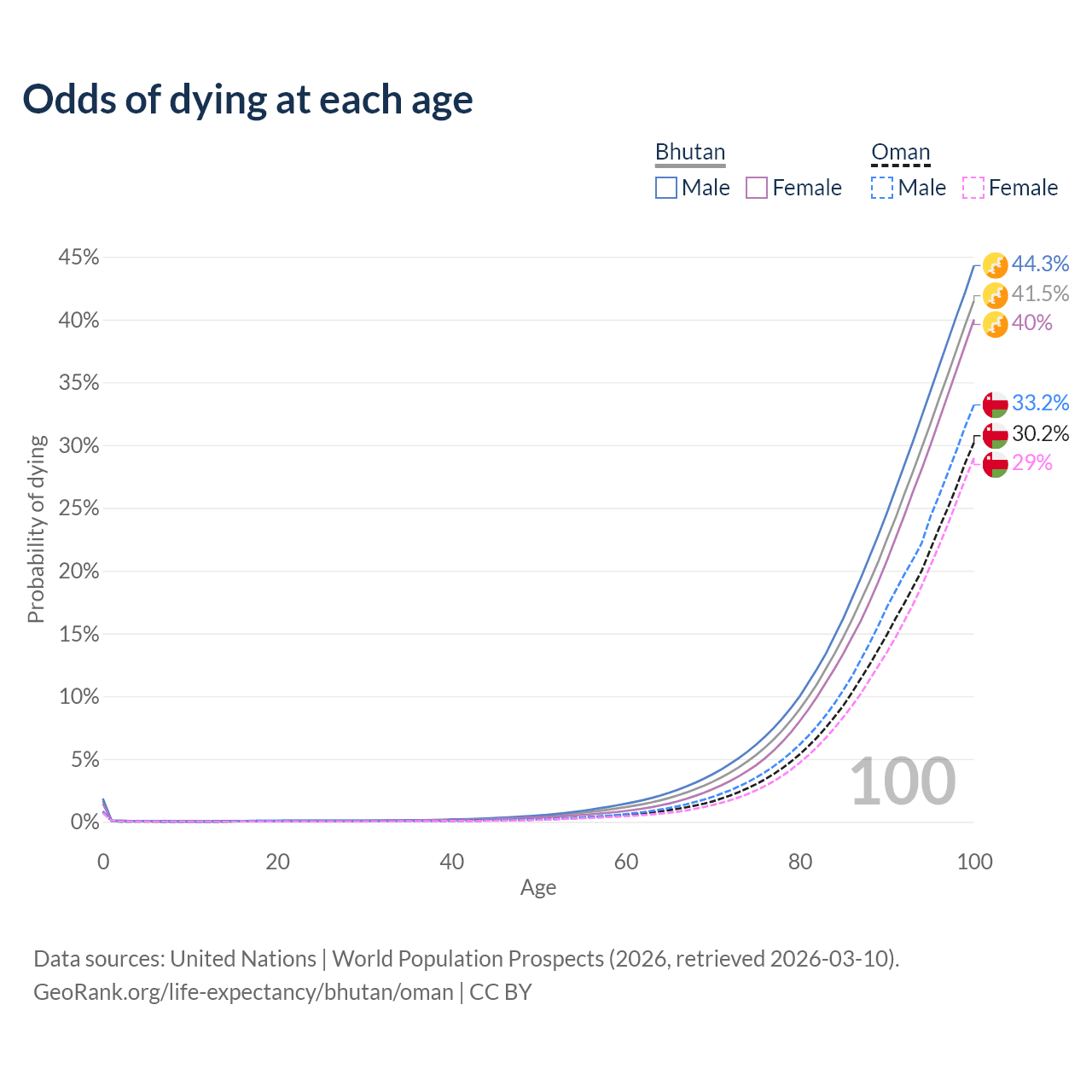 This life expectancy calculator shows the odds of living to 100, 95, 90, and below based on current age for both males and females in Bhutan and Oman, along with mean and median age of death. The calculations are based on the 2026 life tables (actuarial tables) from the UN World Population Prospects.