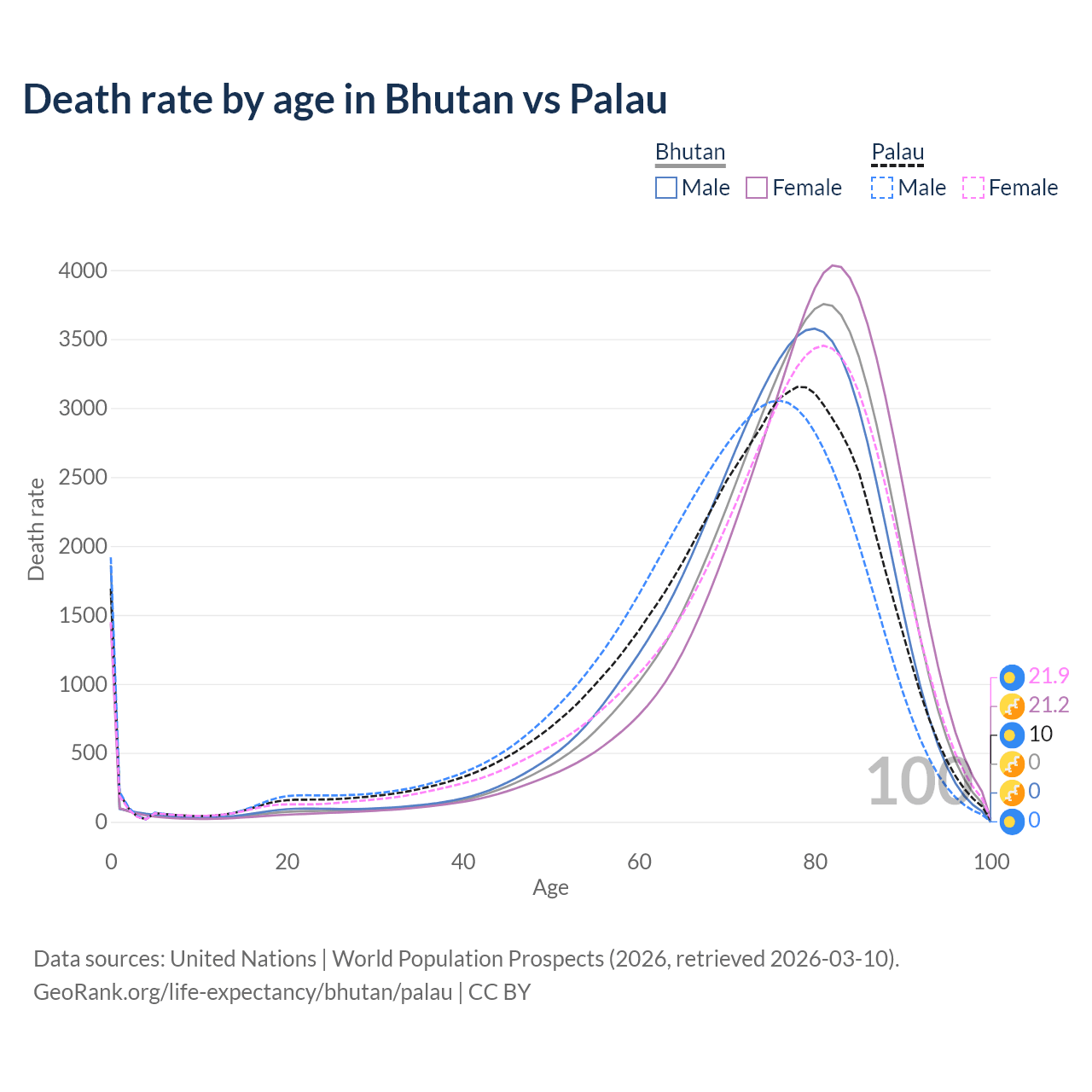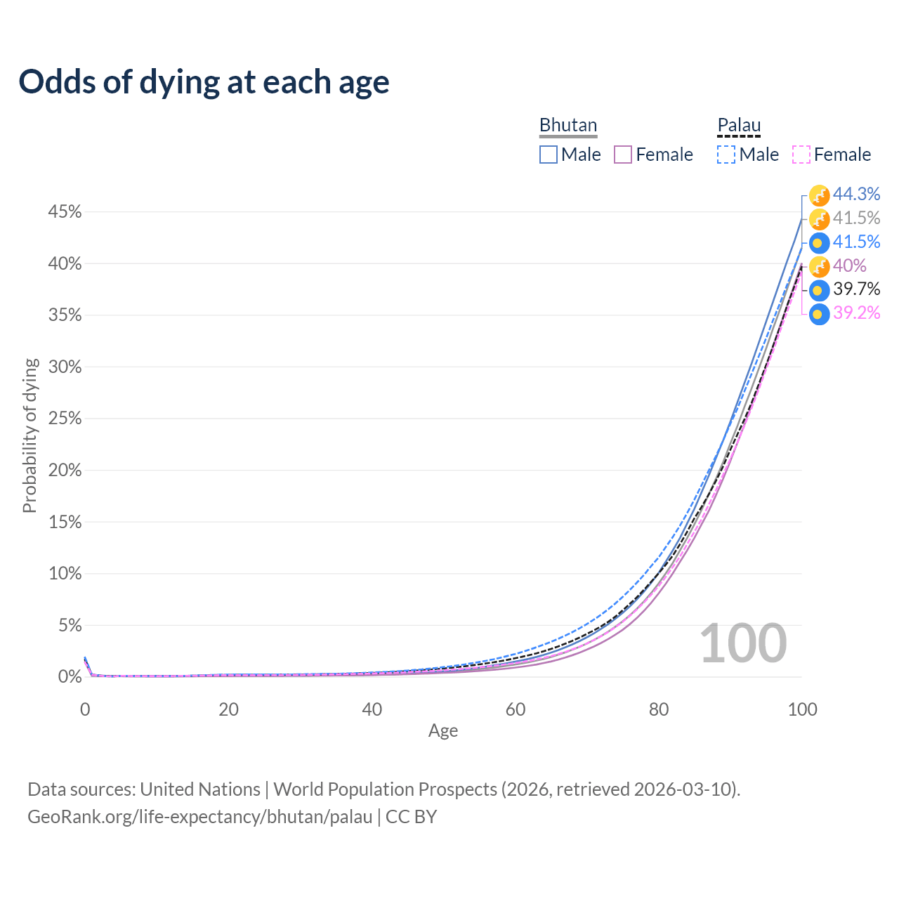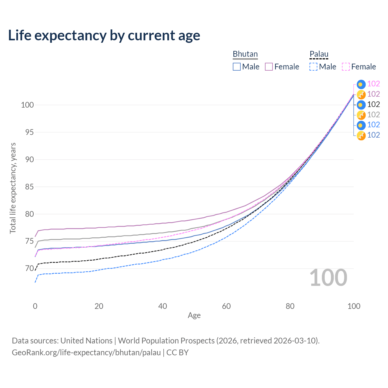 This life expectancy calculator shows the odds of living to 100, 95, 90, and below based on current age for both males and females in Bhutan and Palau, along with mean and median age of death. The calculations are based on the 2026 life tables (actuarial tables) from the UN World Population Prospects.
