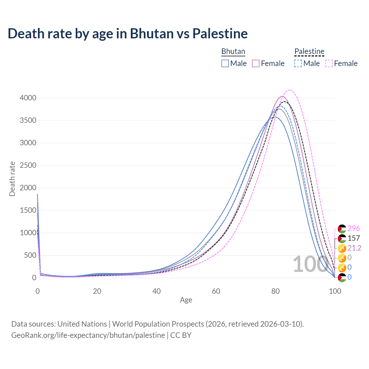In Bhutan, the most common age of death is 81, compared to 83 in Palestine. The median age of death is 77.6 in Bhutan and 80.5 in Palestine, meaning only half of each cohort is expected to live past that age.