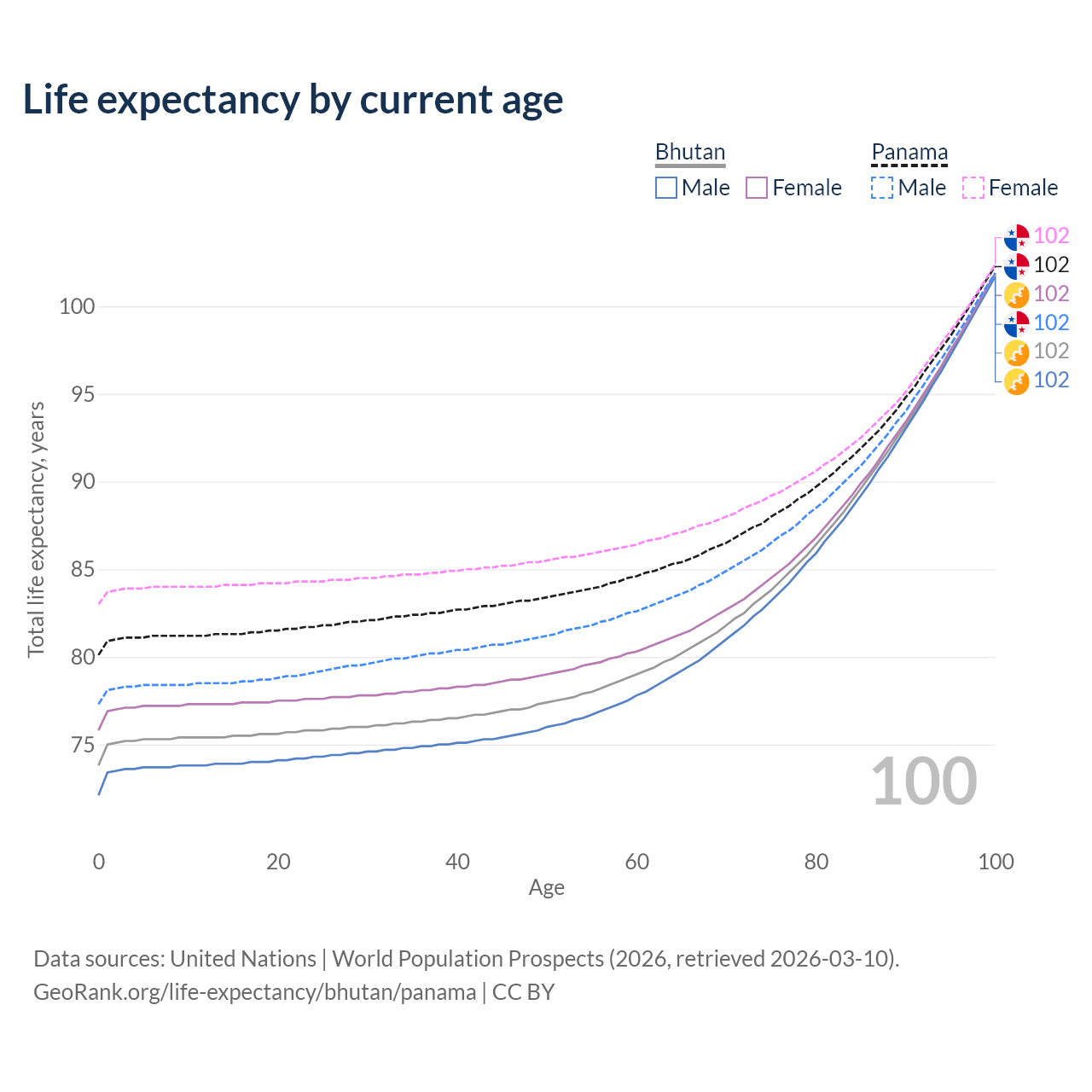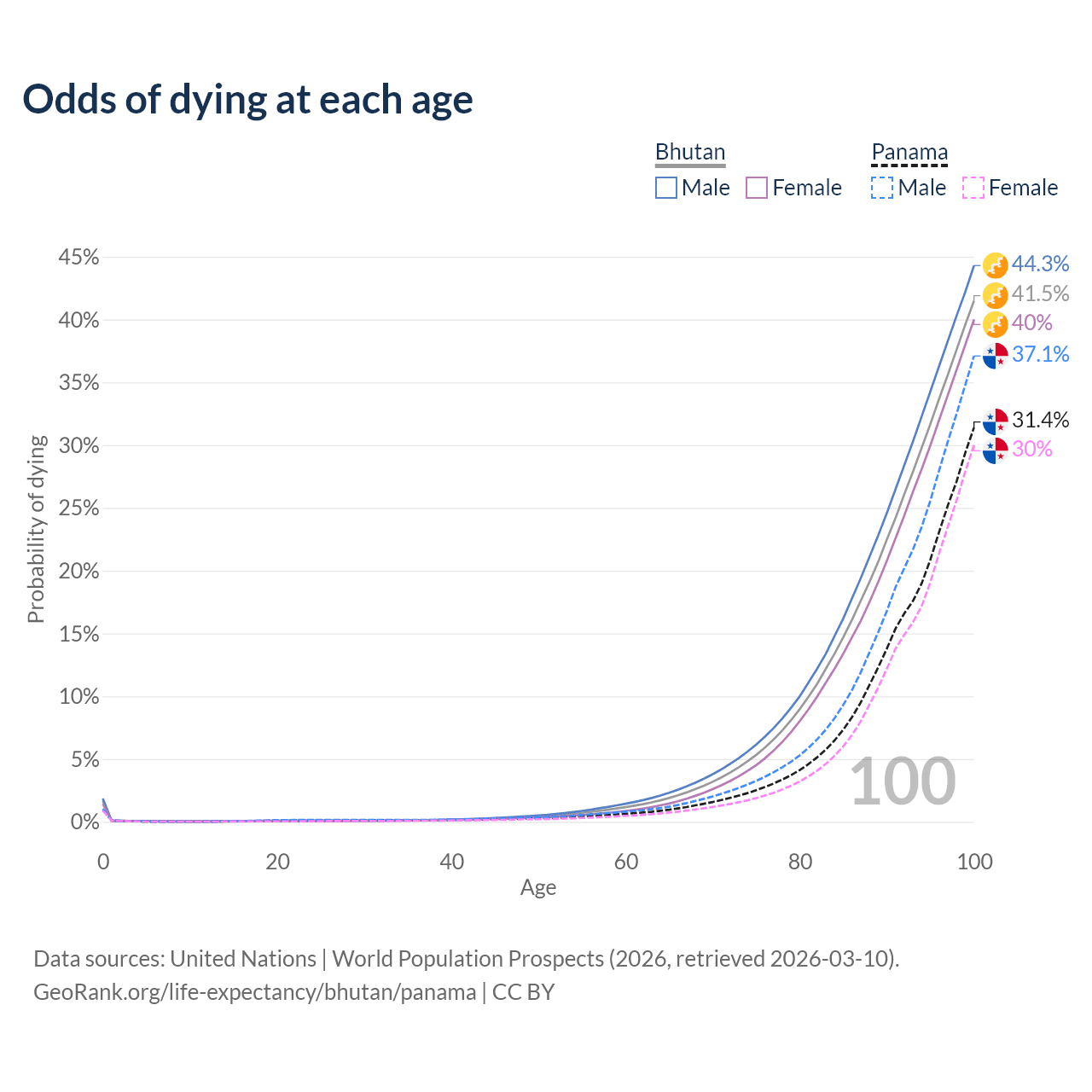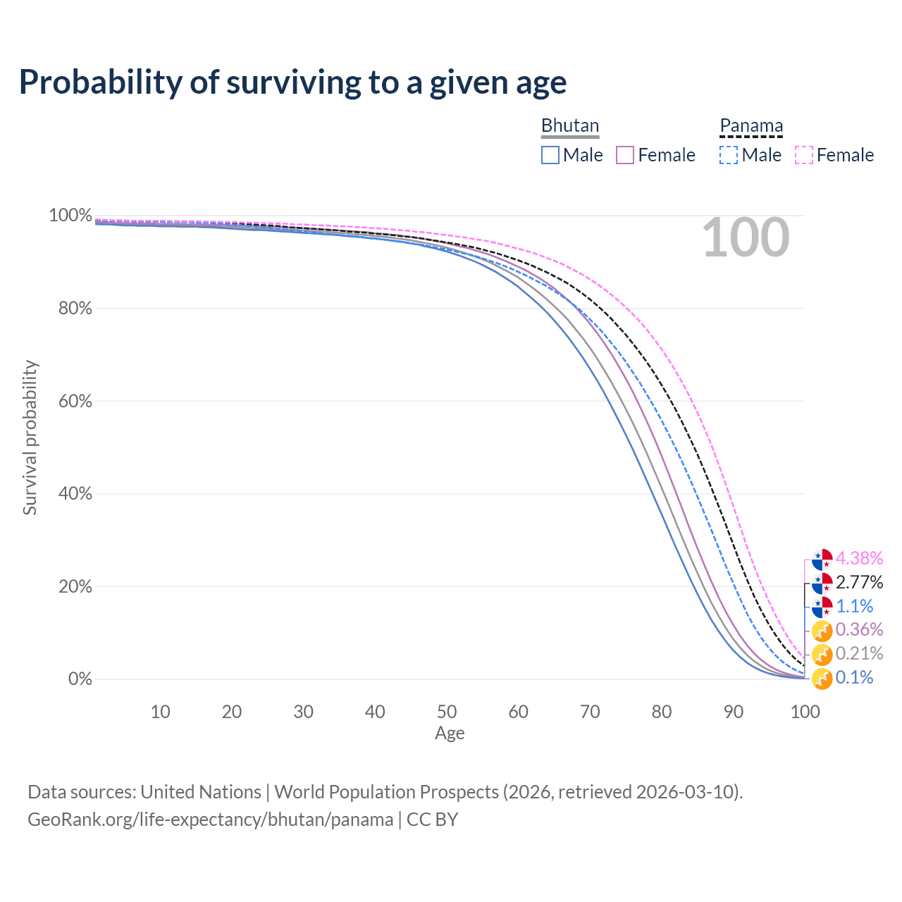 This life expectancy calculator shows the odds of living to 100, 95, 90, and below based on current age for both males and females in Bhutan and Panama, along with mean and median age of death. The calculations are based on the 2026 life tables (actuarial tables) from the UN World Population Prospects.