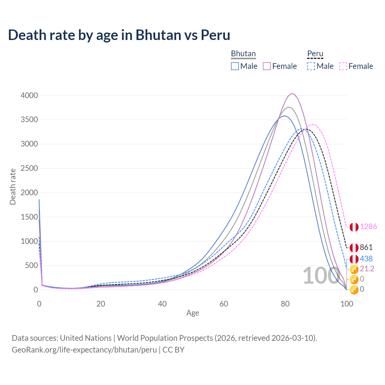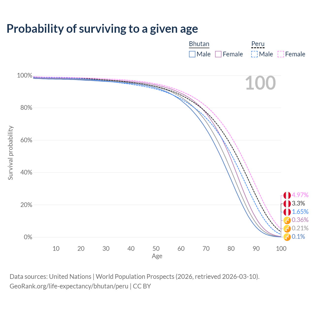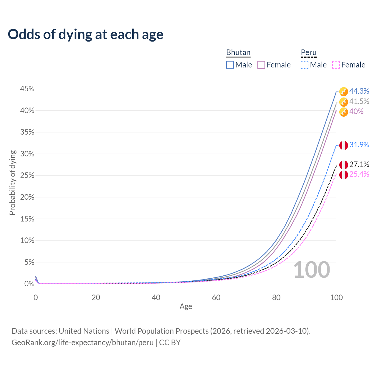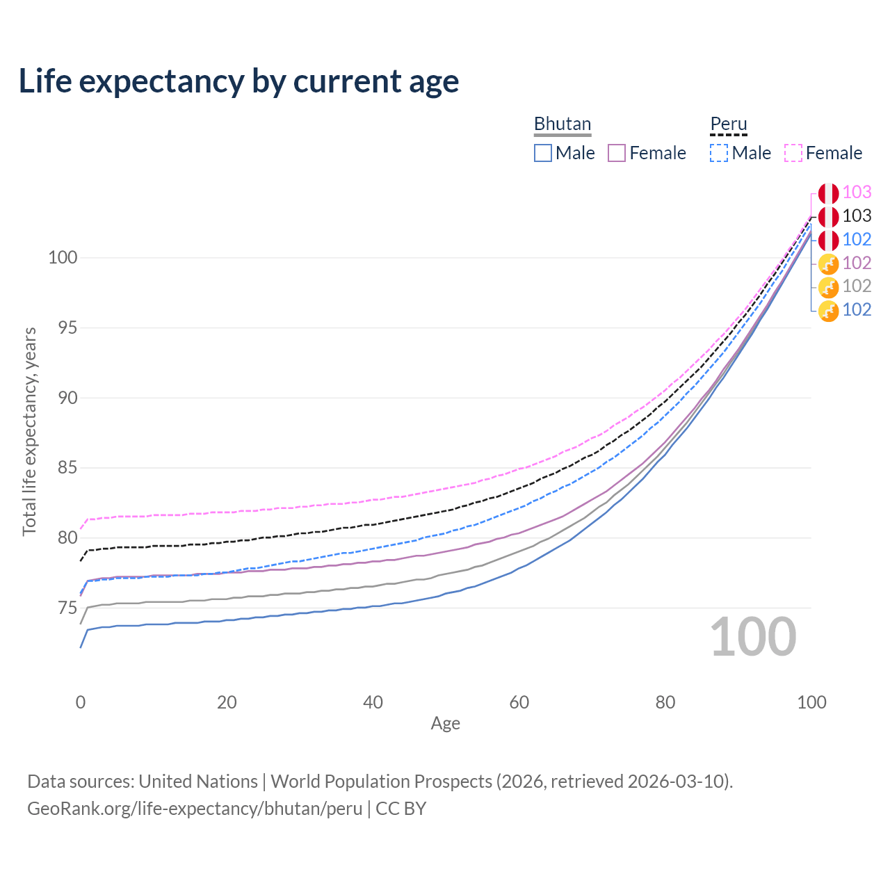 This life expectancy calculator shows the odds of living to 100, 95, 90, and below based on current age for both males and females in Bhutan and Peru, along with mean and median age of death. The calculations are based on the 2026 life tables (actuarial tables) from the UN World Population Prospects.