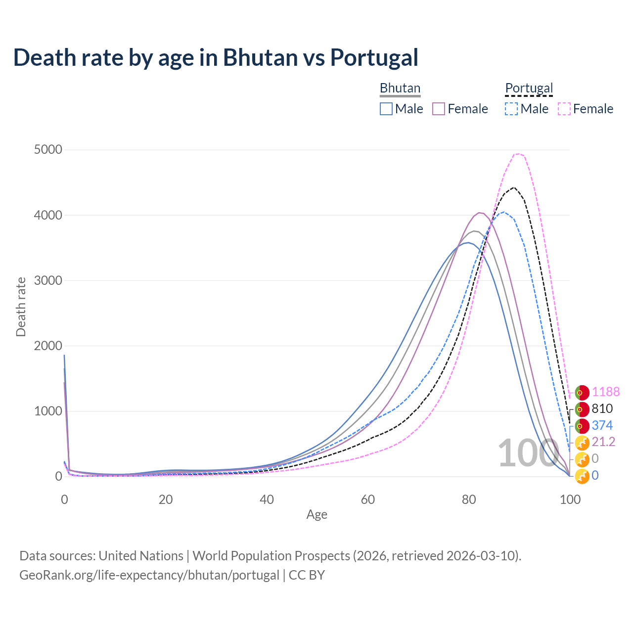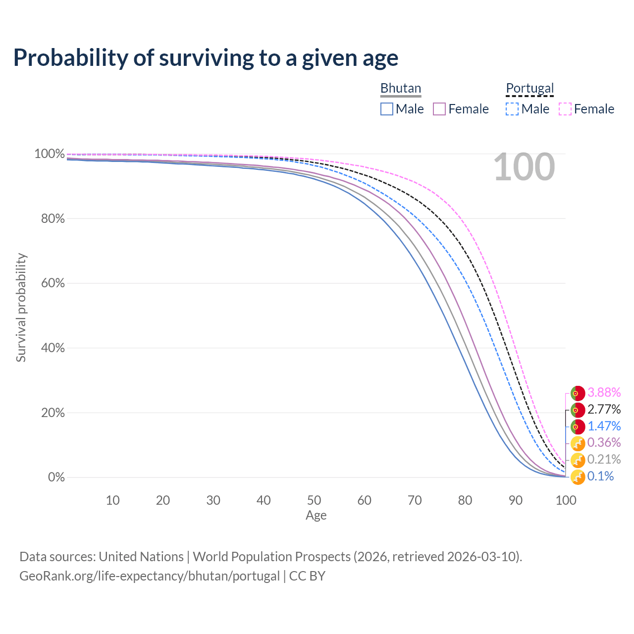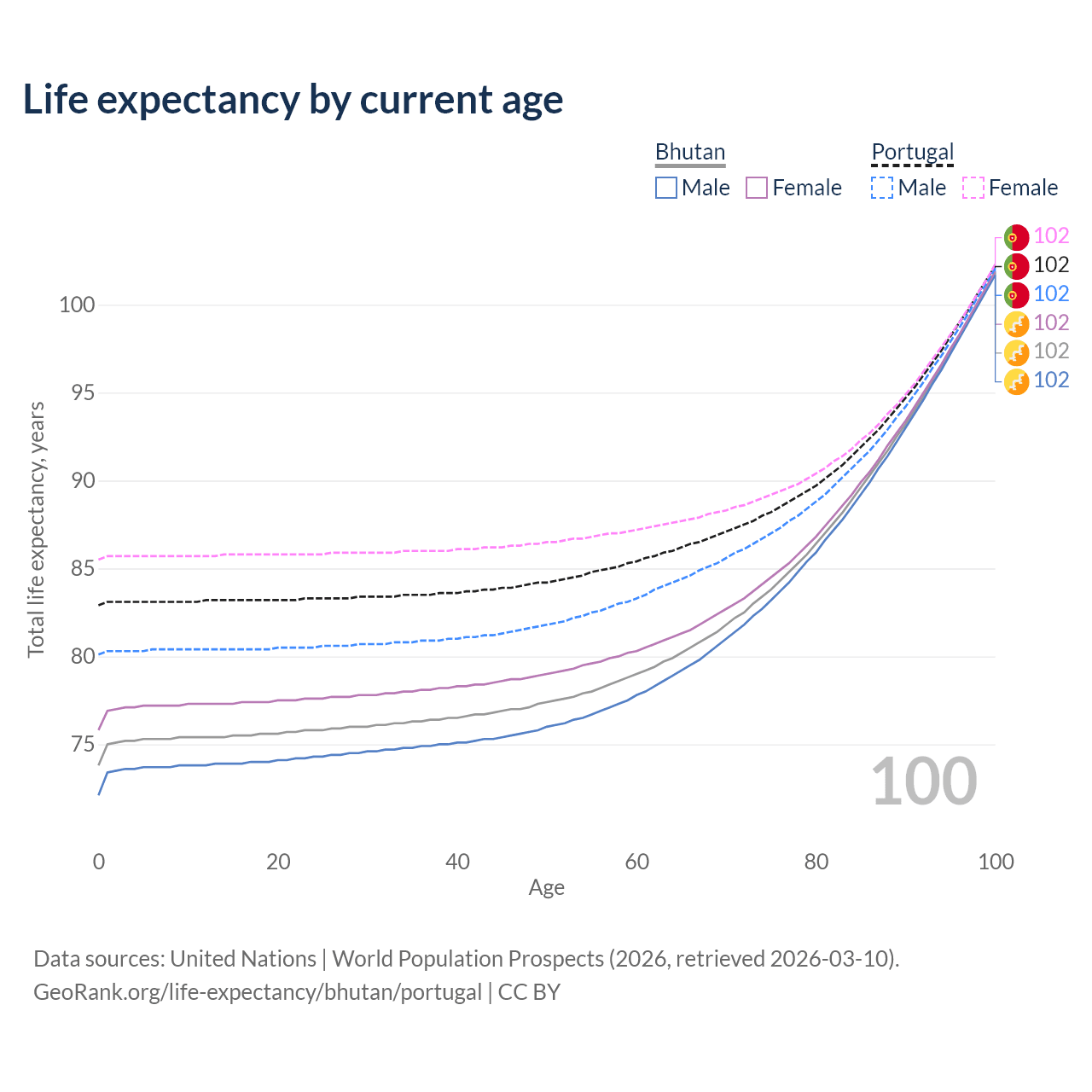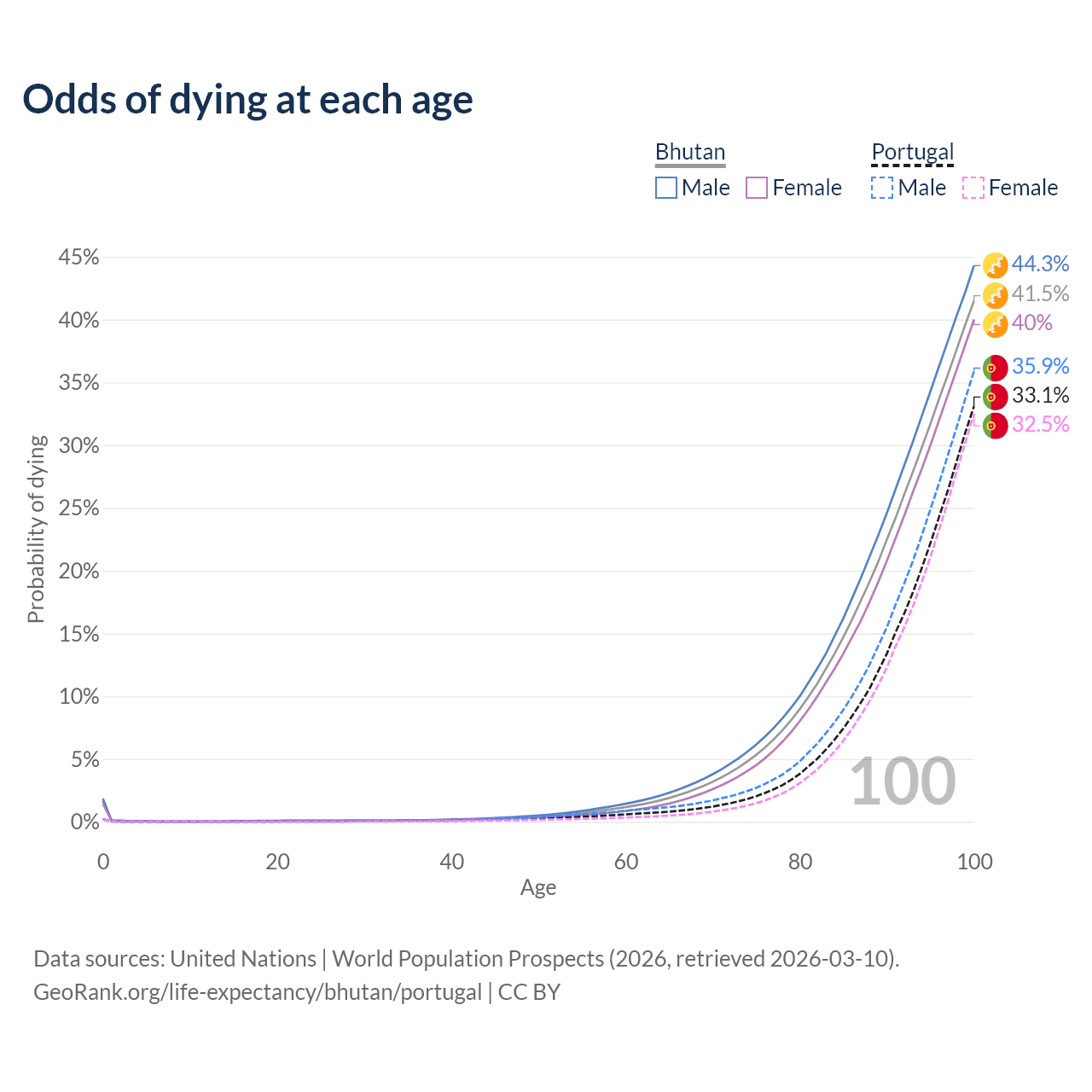 This life expectancy calculator shows the odds of living to 100, 95, 90, and below based on current age for both males and females in Bhutan and Portugal, along with mean and median age of death. The calculations are based on the 2026 life tables (actuarial tables) from the UN World Population Prospects.