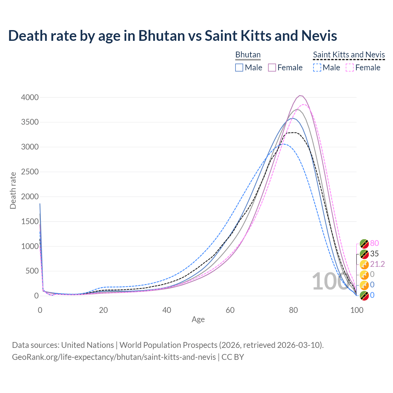 In Bhutan, the most common age of death is 81, compared to 80 in Saint Kitts and Nevis. The median age of death is 77.6 in Bhutan and 76.3 in Saint Kitts and Nevis, meaning only half of each cohort is expected to live past that age.