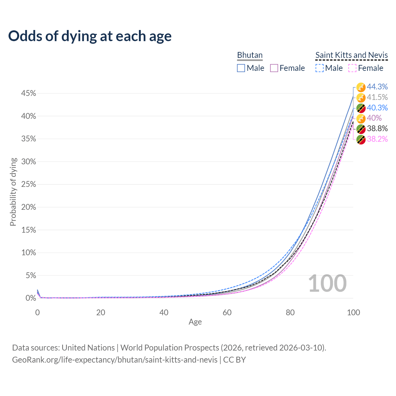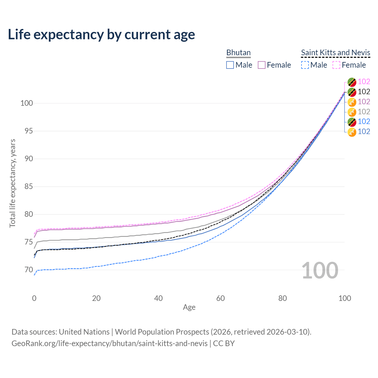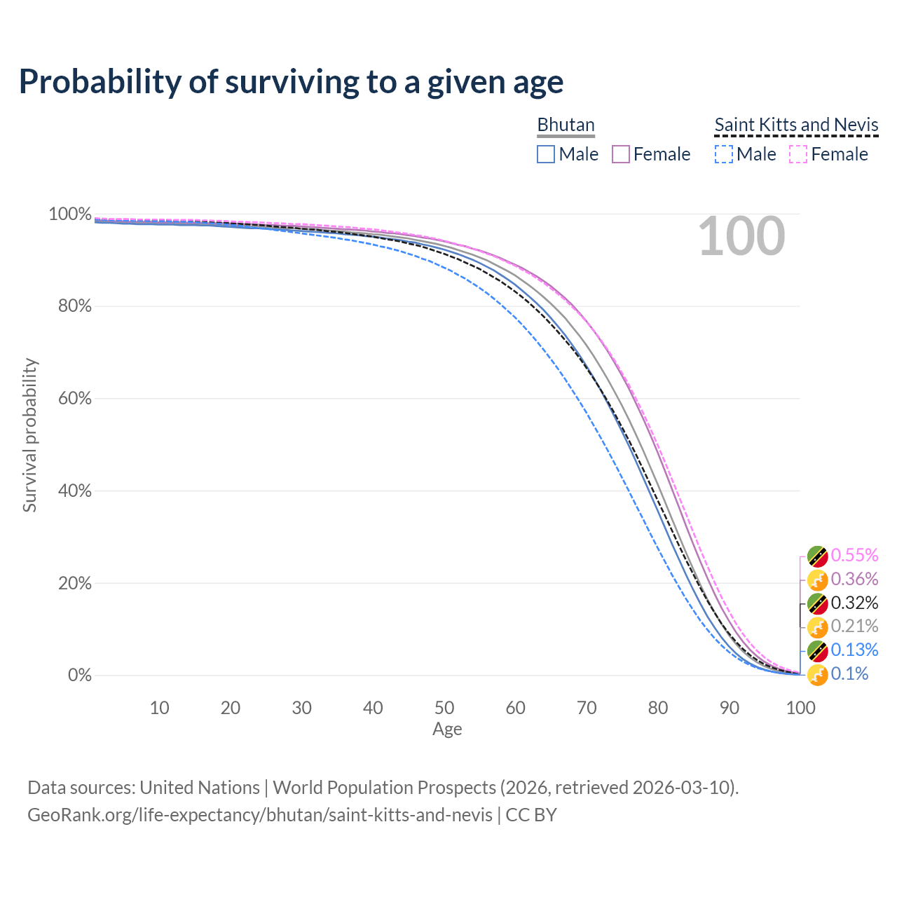 This life expectancy calculator shows the odds of living to 100, 95, 90, and below based on current age for both males and females in Bhutan and Saint Kitts and Nevis, along with mean and median age of death. The calculations are based on the 2026 life tables (actuarial tables) from the UN World Population Prospects.