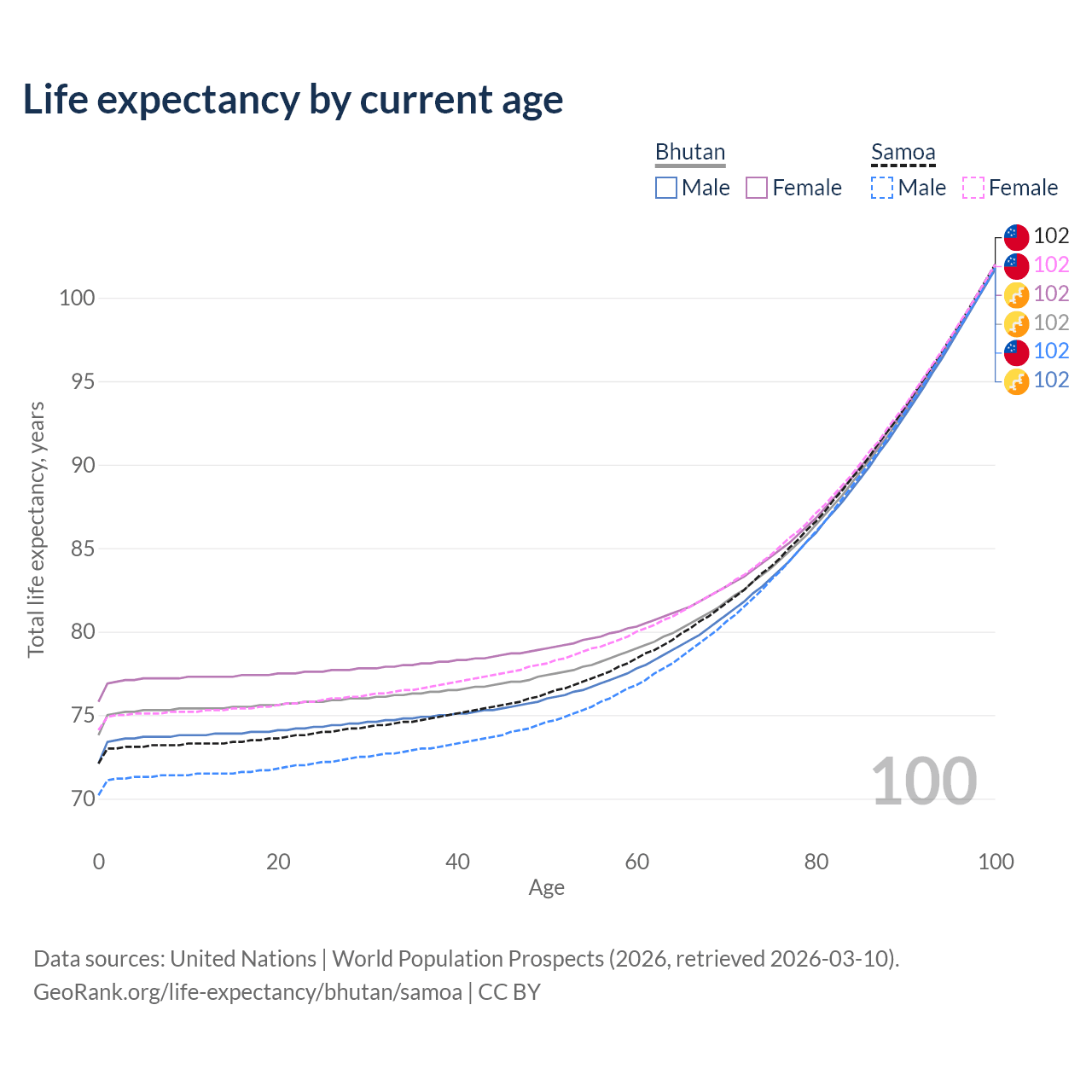 This life expectancy calculator shows the odds of living to 100, 95, 90, and below based on current age for both males and females in Bhutan and Samoa, along with mean and median age of death. The calculations are based on the 2026 life tables (actuarial tables) from the UN World Population Prospects.