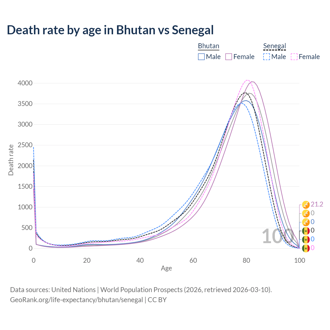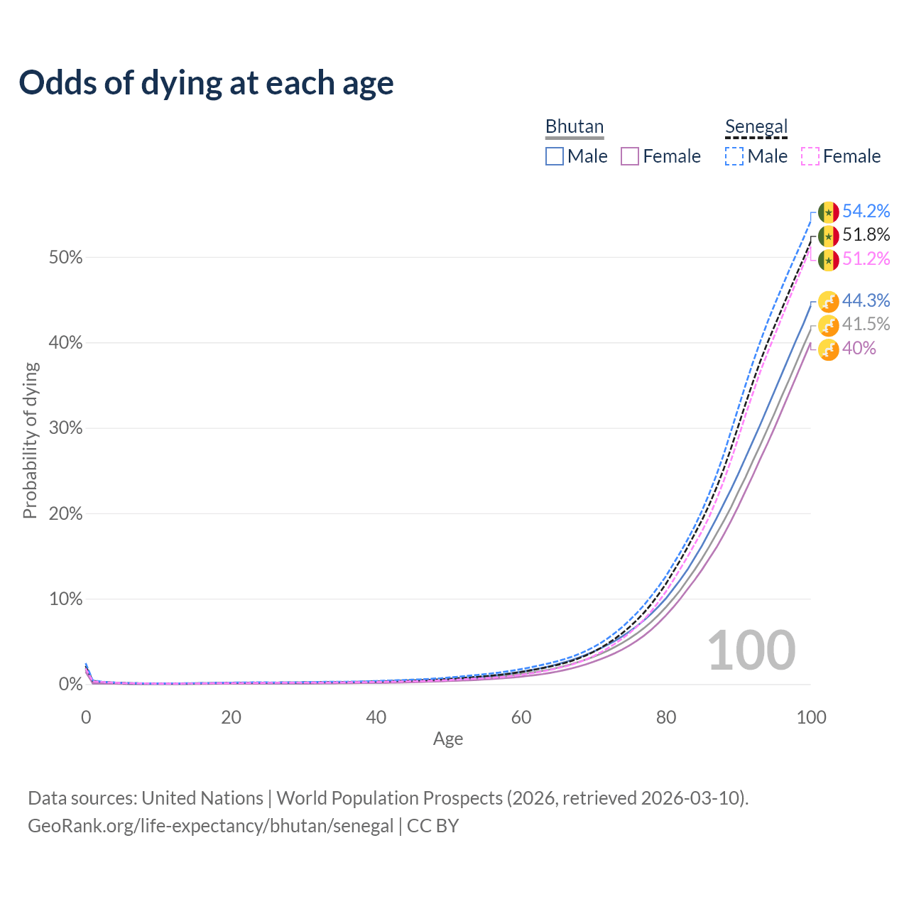 This life expectancy calculator shows the odds of living to 100, 95, 90, and below based on current age for both males and females in Bhutan and Senegal, along with mean and median age of death. The calculations are based on the 2026 life tables (actuarial tables) from the UN World Population Prospects.