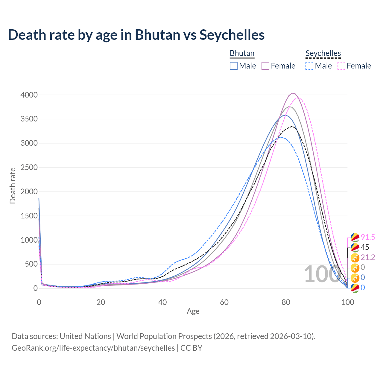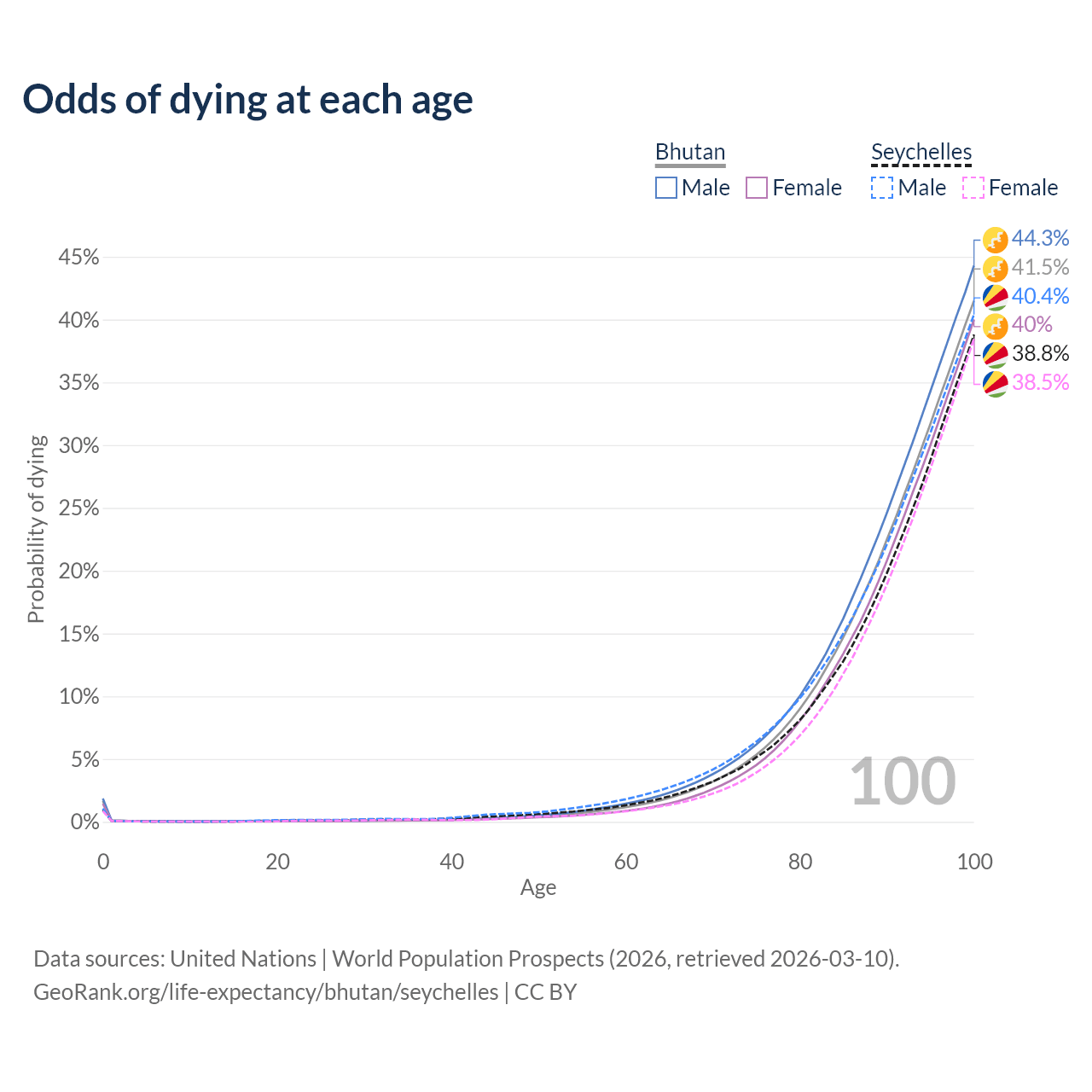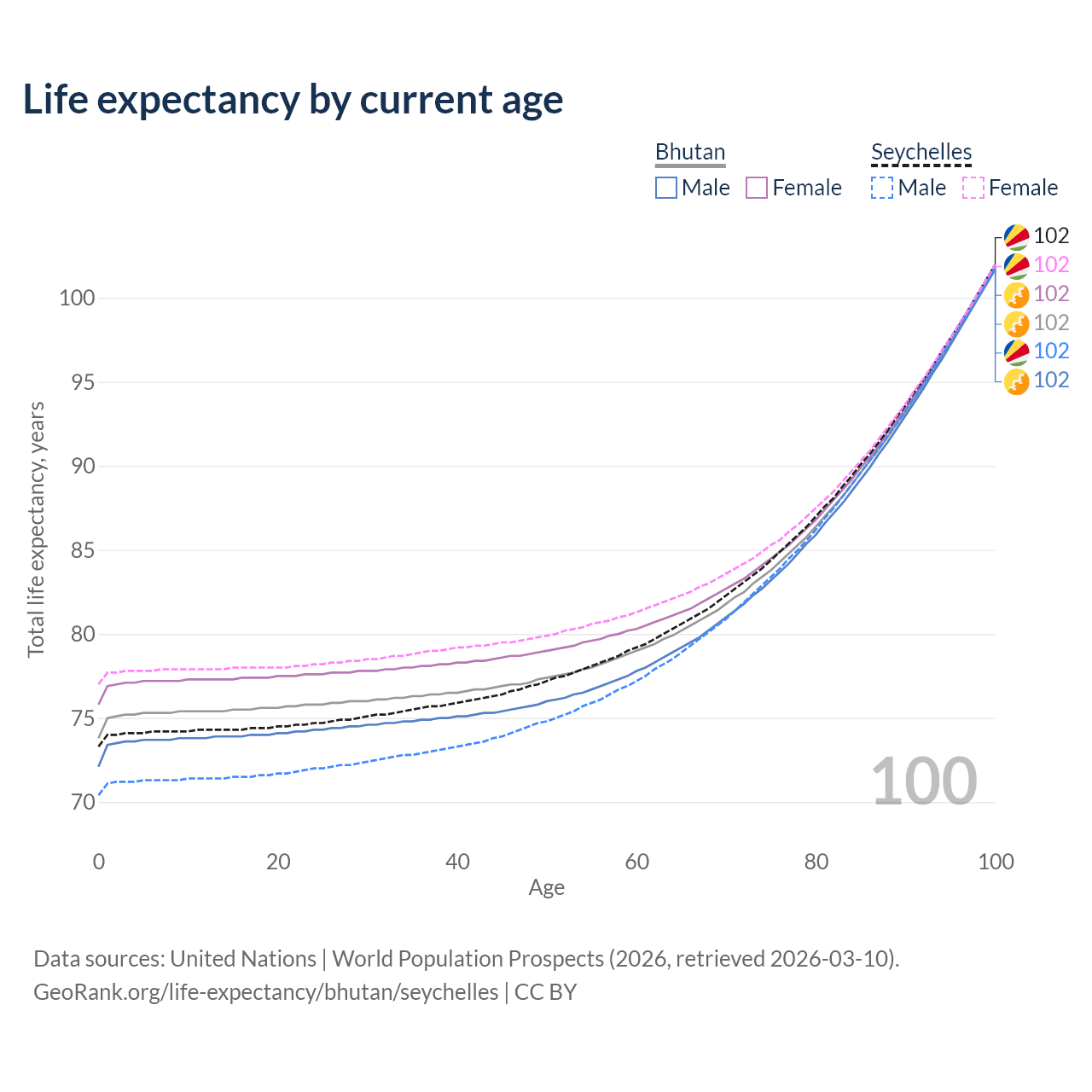 This life expectancy calculator shows the odds of living to 100, 95, 90, and below based on current age for both males and females in Bhutan and the Seychelles, along with mean and median age of death. The calculations are based on the 2026 life tables (actuarial tables) from the UN World Population Prospects.