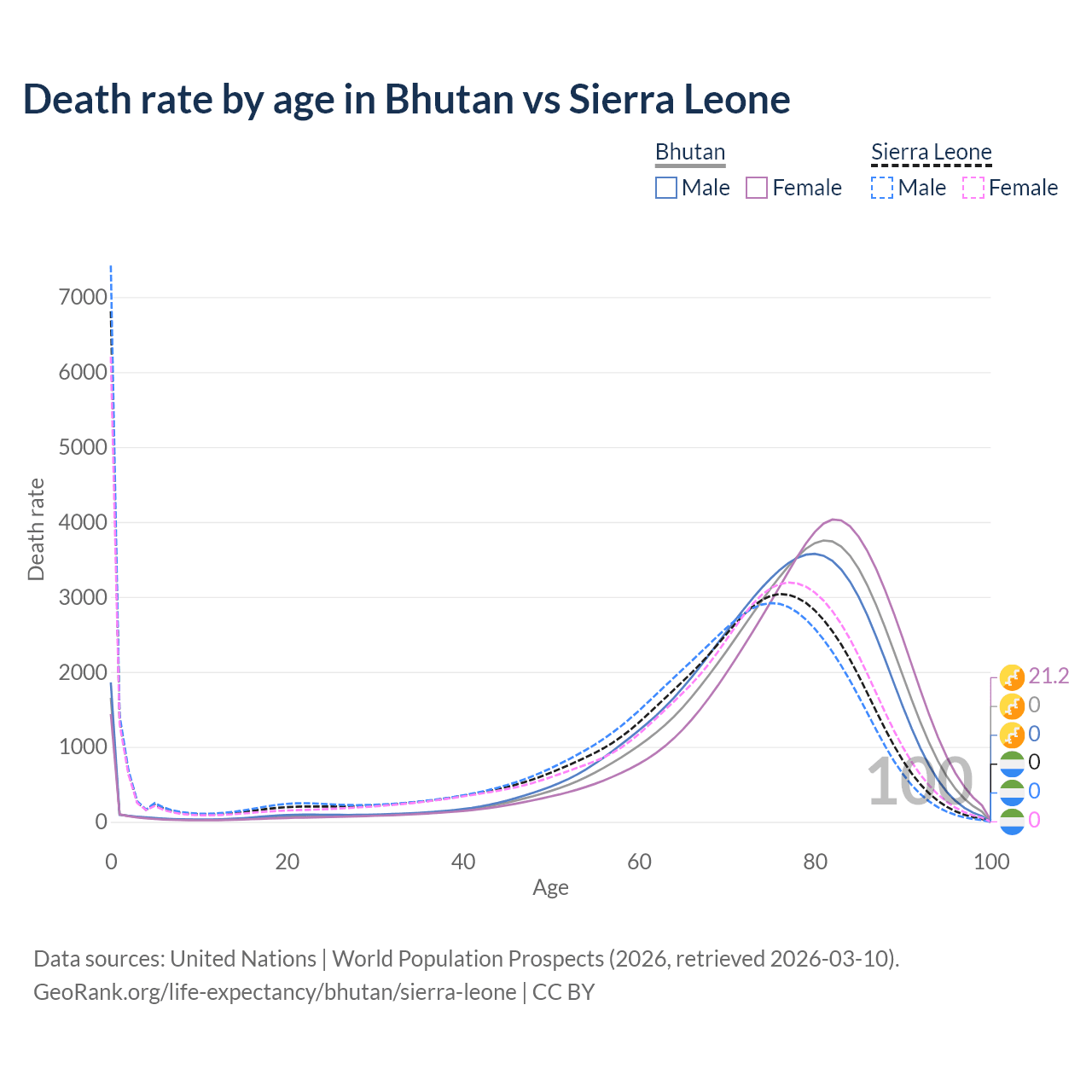 In Bhutan, the most common age of death is 81, compared to 0 in Sierra Leone. The median age of death is 77.6 in Bhutan and 70.8 in Sierra Leone, meaning only half of each cohort is expected to live past that age.