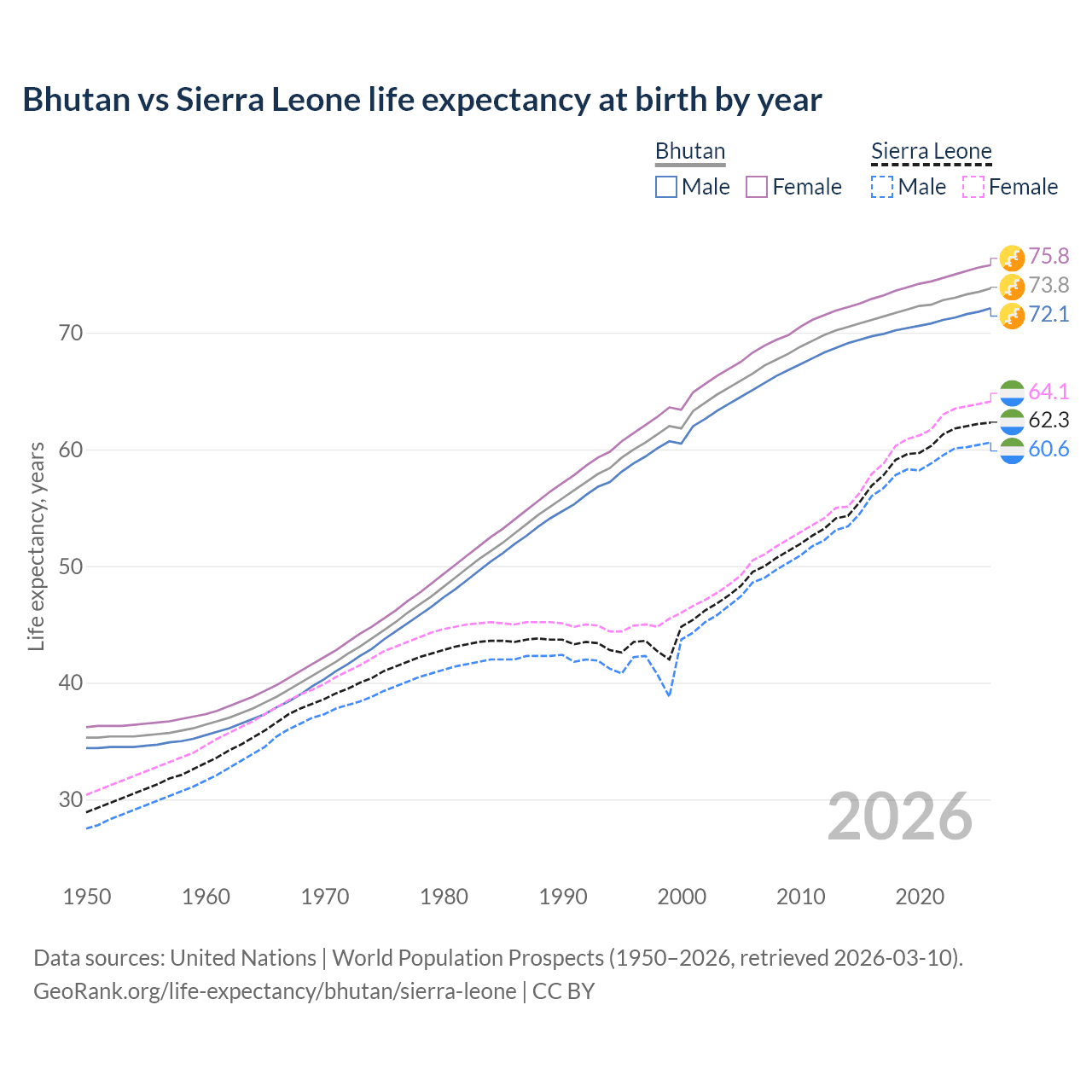 The average life expectancy at birth is 73.8 years in Bhutan vs 62.3 in Sierra Leone. Bhutan is ranked 106/197 by life expectancy, and Sierra Leone is 186/197. In Bhutan, the life expectancy is 72.1 years for males and 75.8 years for females. In Sierra Leone, it's 60.6 years for males and 64.1 years for females.
