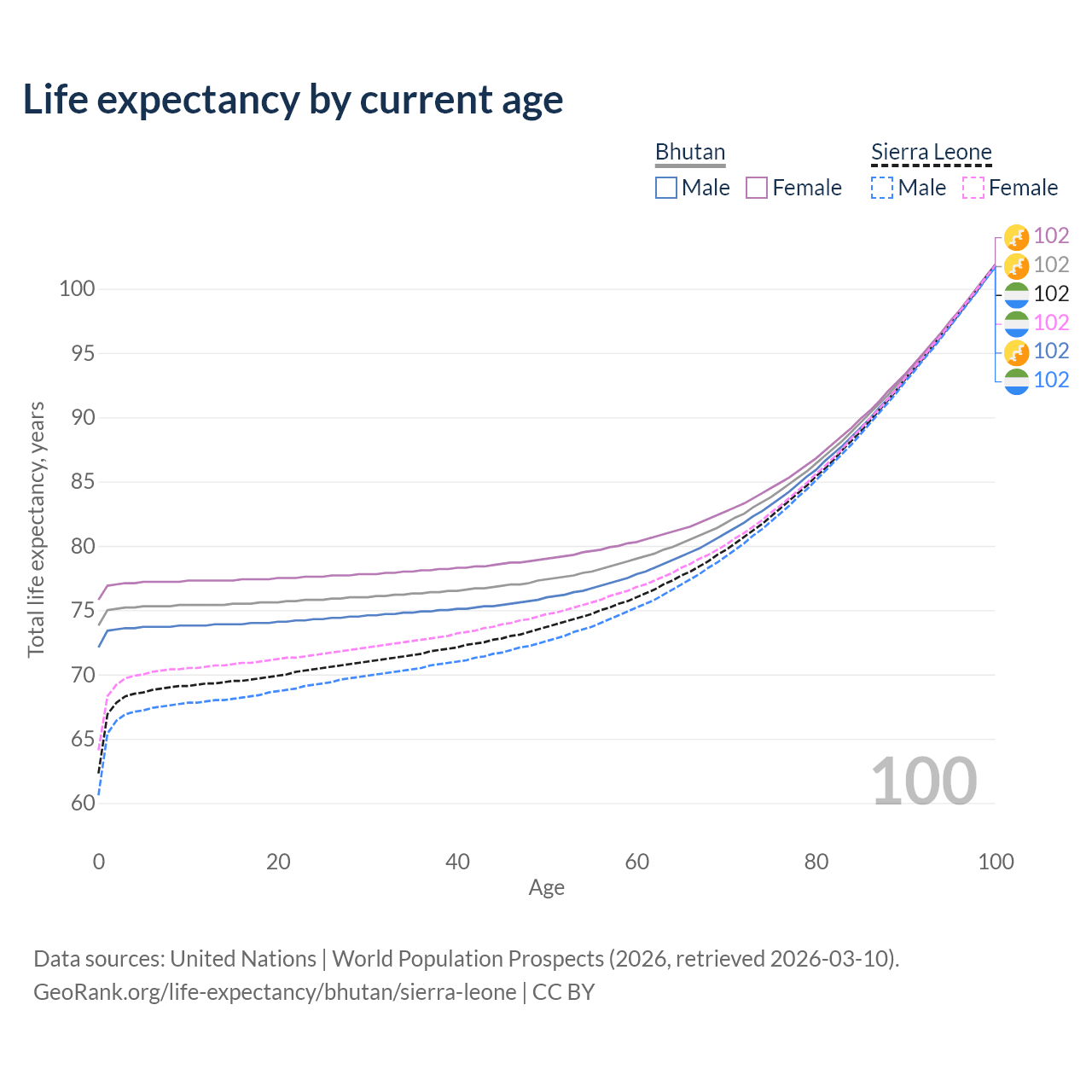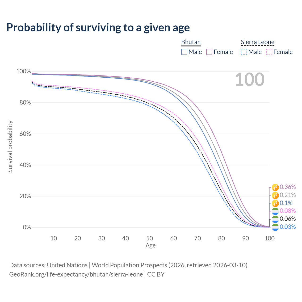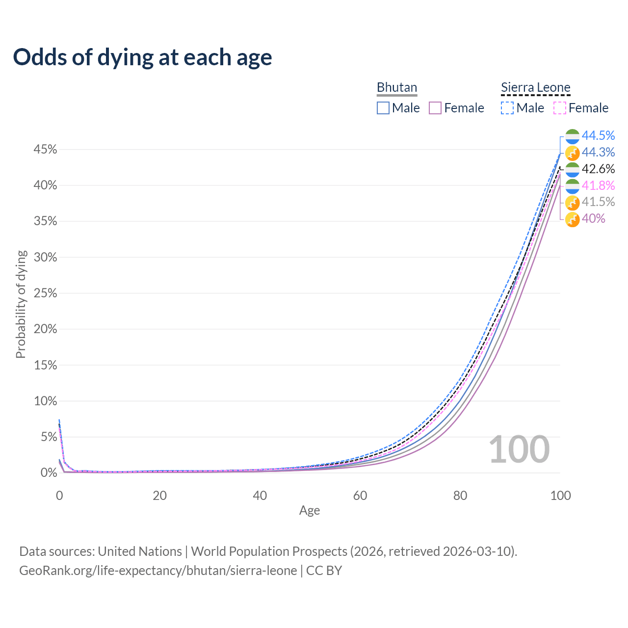 This life expectancy calculator shows the odds of living to 100, 95, 90, and below based on current age for both males and females in Bhutan and Sierra Leone, along with mean and median age of death. The calculations are based on the 2026 life tables (actuarial tables) from the UN World Population Prospects.