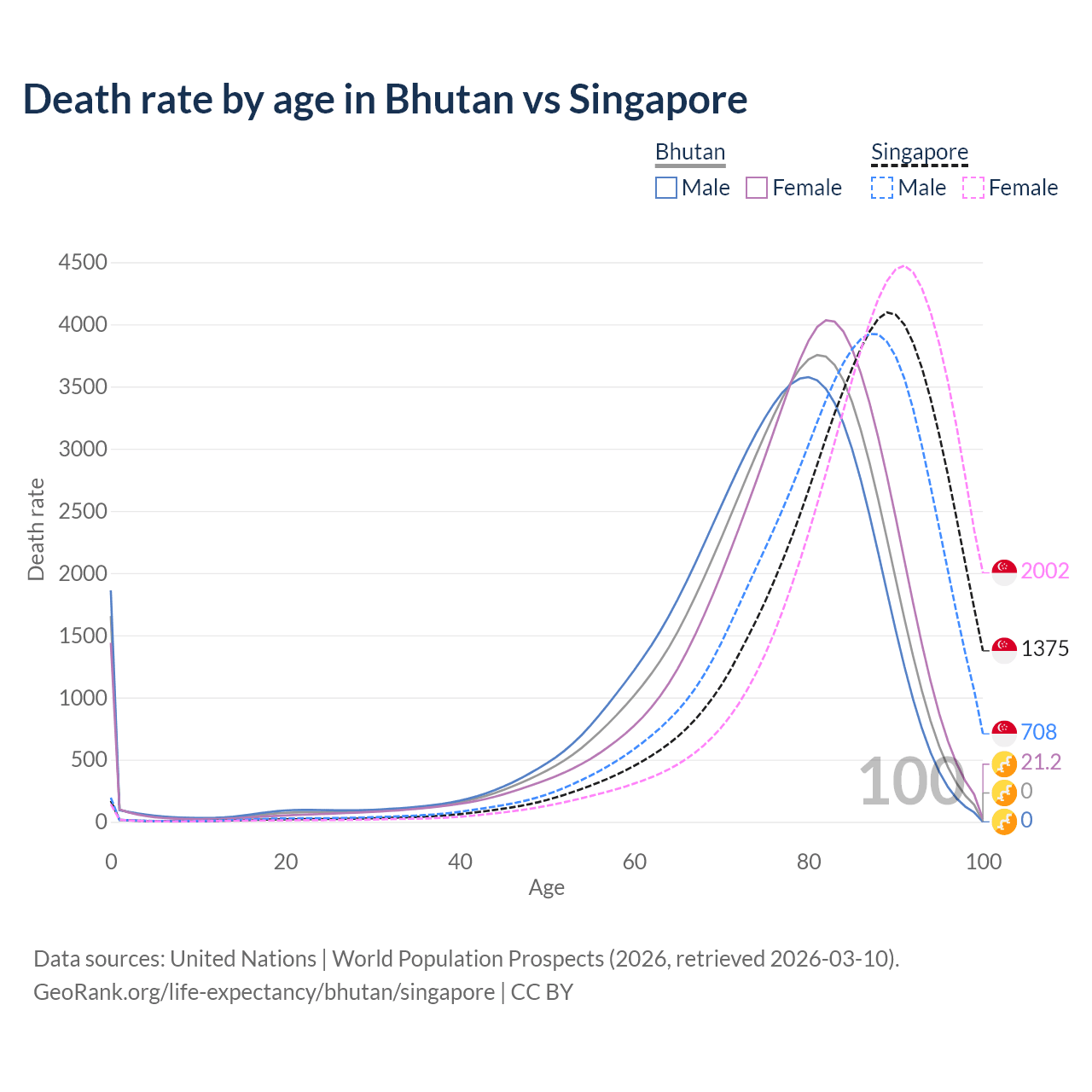 In Bhutan, the most common age of death is 81, compared to 89 in Singapore. The median age of death is 77.6 in Bhutan and 86.5 in Singapore, meaning only half of each cohort is expected to live past that age.
