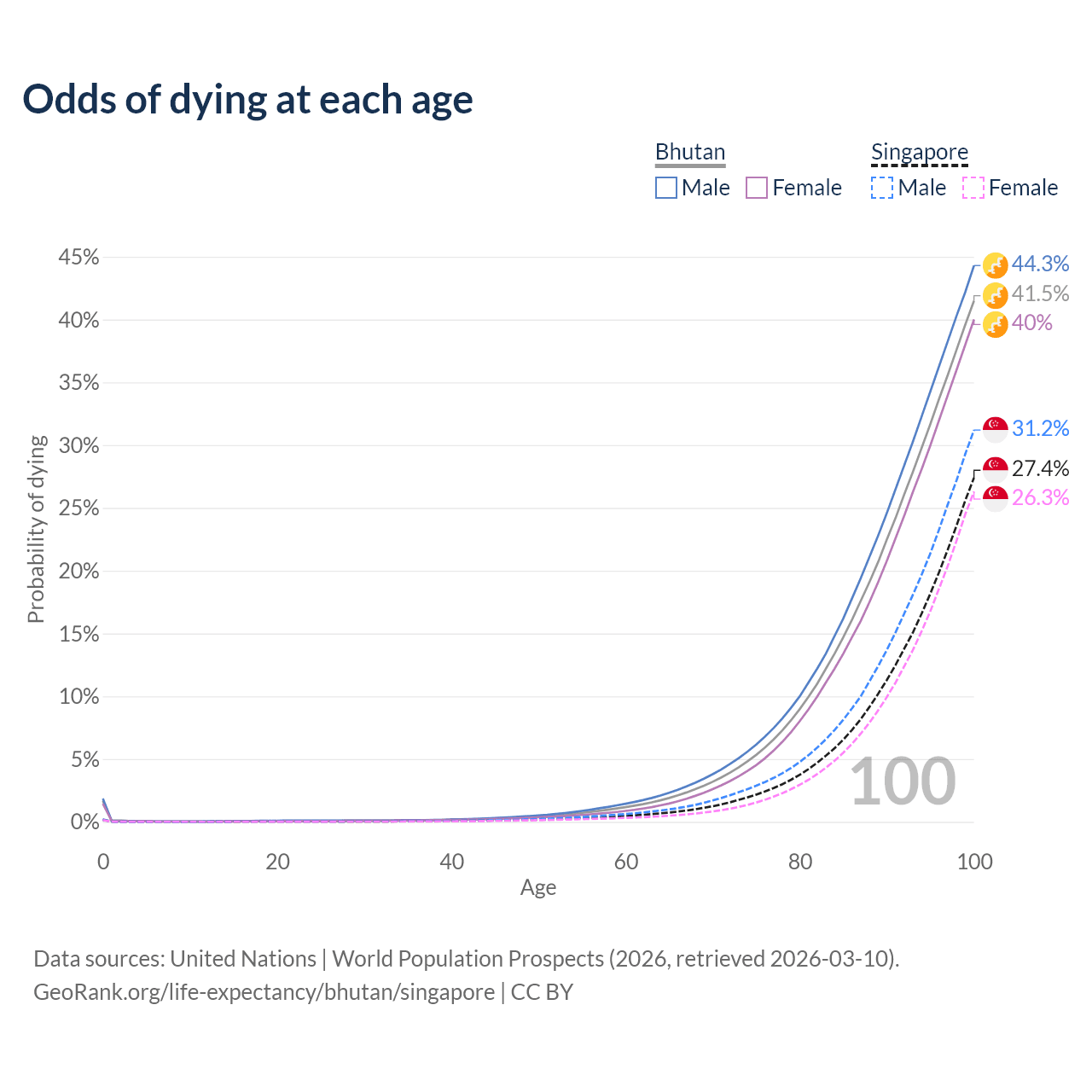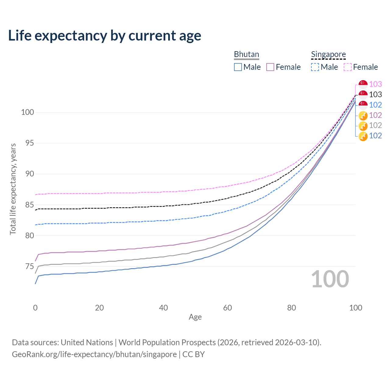 This life expectancy calculator shows the odds of living to 100, 95, 90, and below based on current age for both males and females in Bhutan and Singapore, along with mean and median age of death. The calculations are based on the 2026 life tables (actuarial tables) from the UN World Population Prospects.