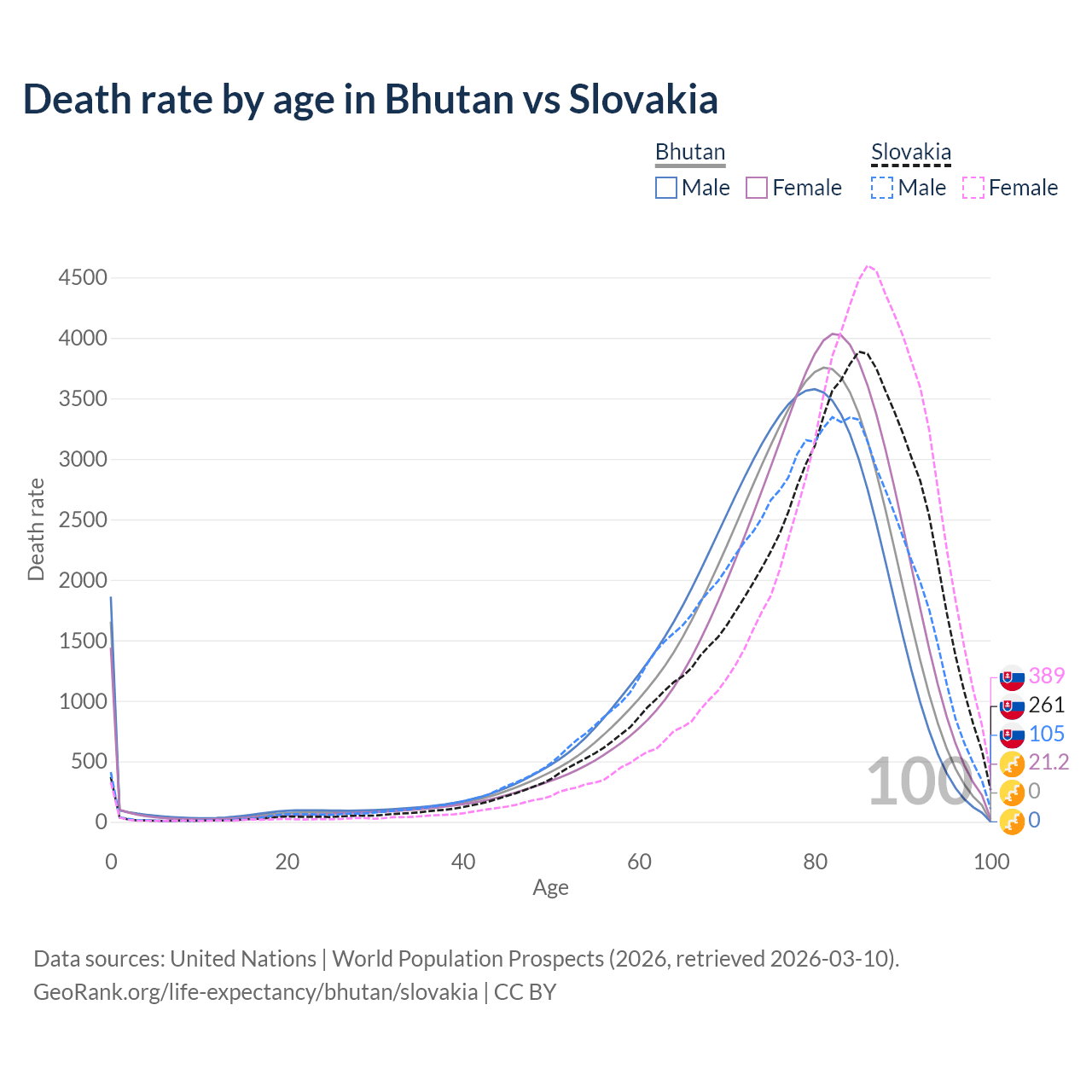This life expectancy calculator shows the odds of living to 100, 95, 90, and below based on current age for both males and females in Bhutan and Slovakia, along with mean and median age of death. The calculations are based on the 2026 life tables (actuarial tables) from the UN World Population Prospects.