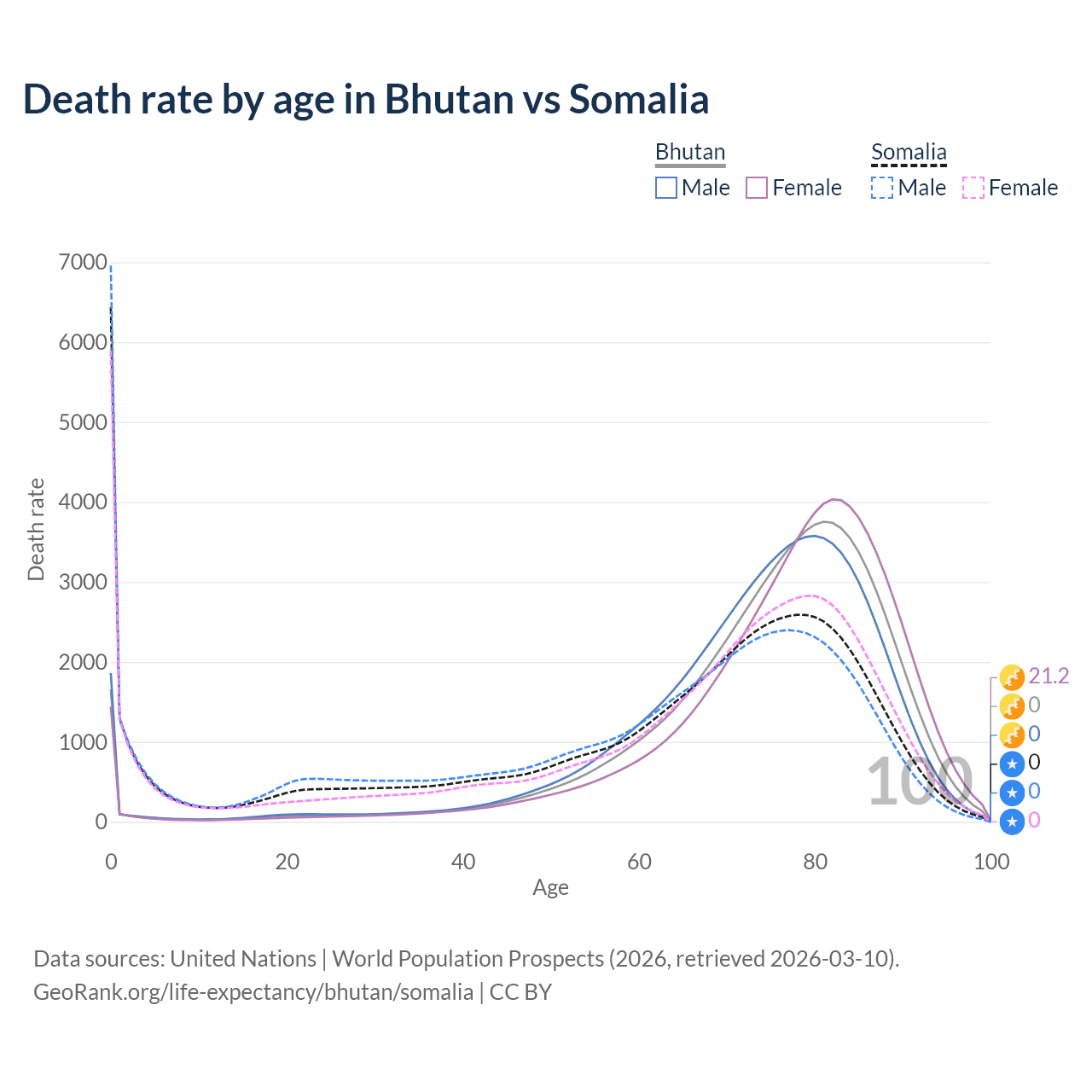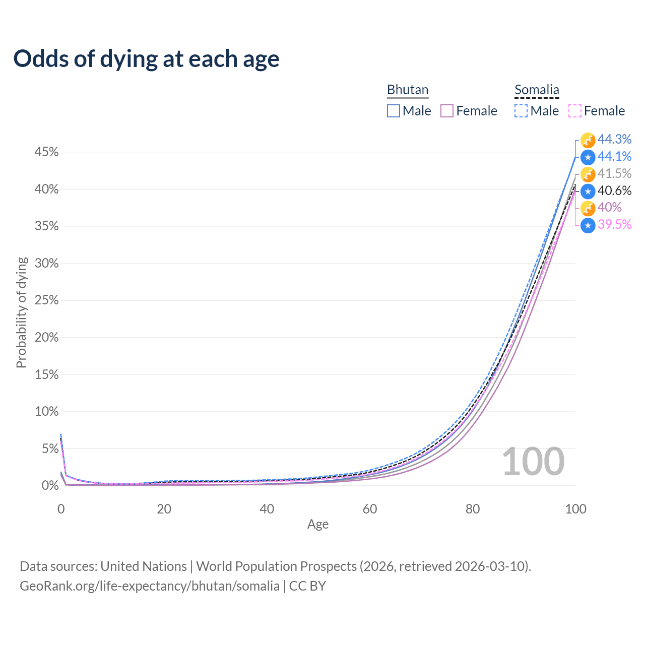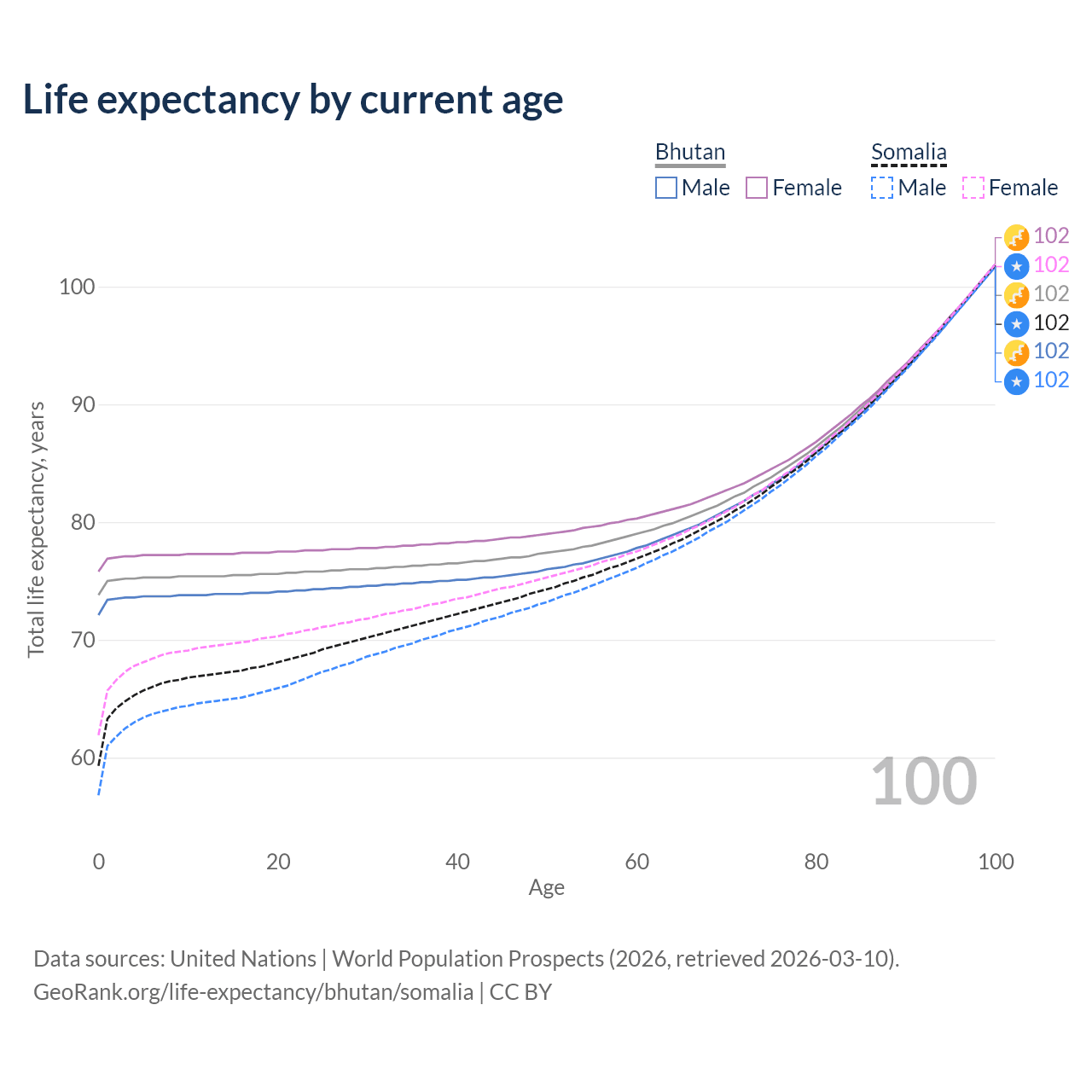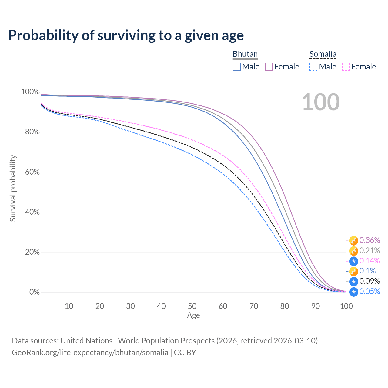 This life expectancy calculator shows the odds of living to 100, 95, 90, and below based on current age for both males and females in Bhutan and Somalia, along with mean and median age of death. The calculations are based on the 2026 life tables (actuarial tables) from the UN World Population Prospects.