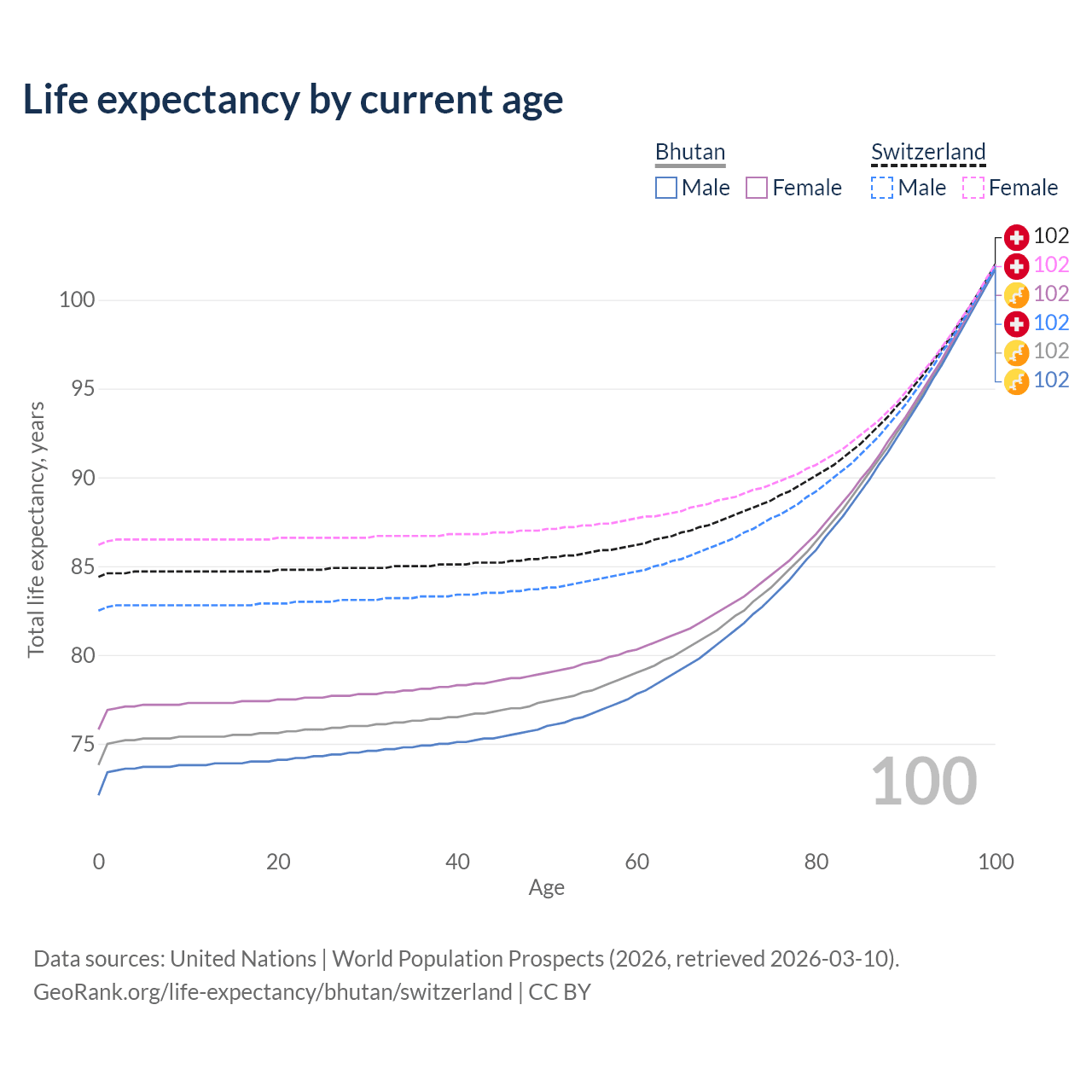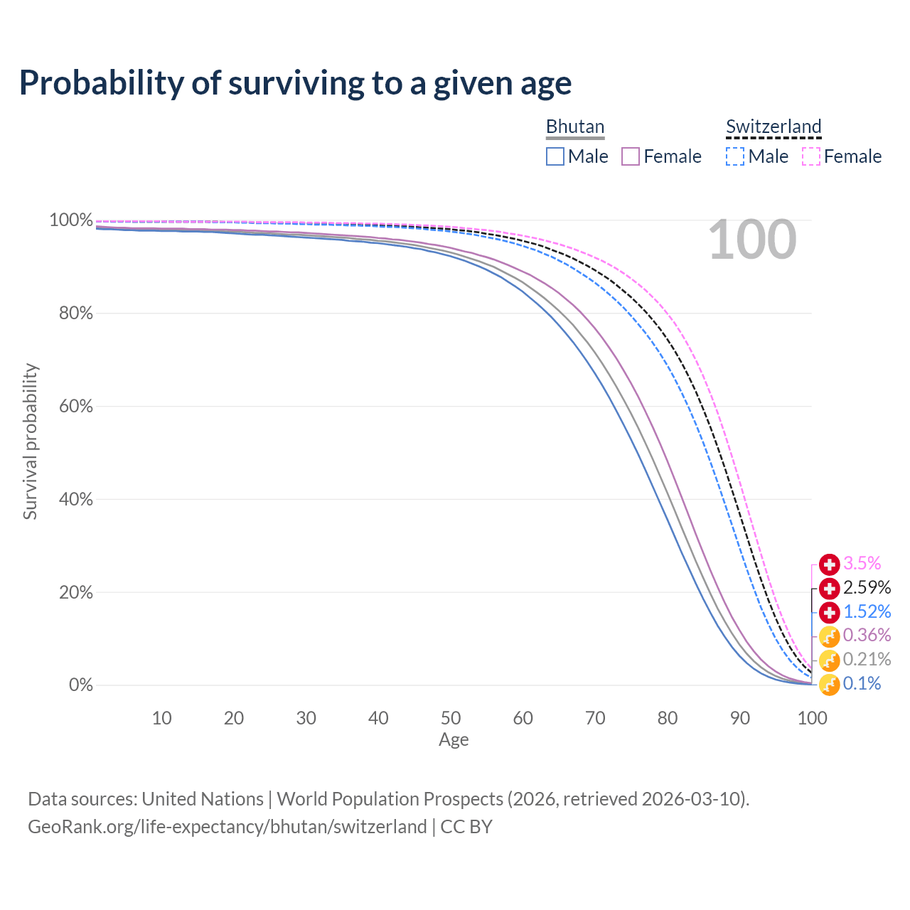 This life expectancy calculator shows the odds of living to 100, 95, 90, and below based on current age for both males and females in Bhutan and Switzerland, along with mean and median age of death. The calculations are based on the 2026 life tables (actuarial tables) from the UN World Population Prospects.