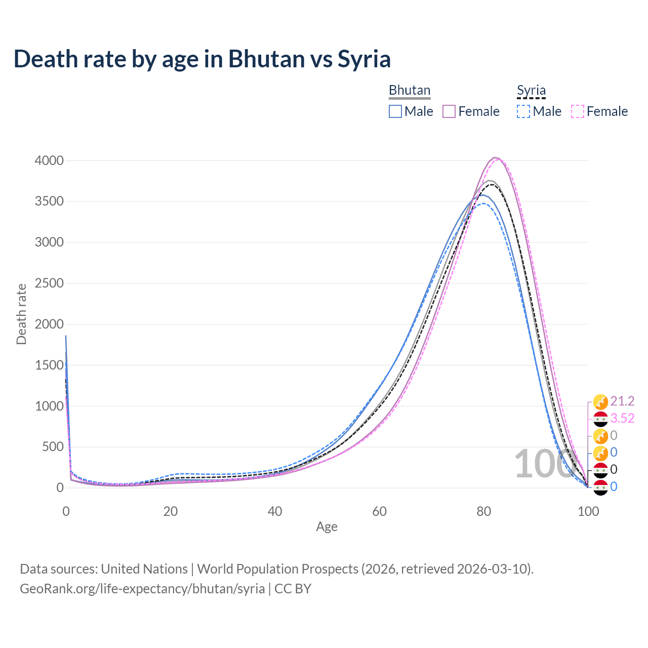 In Bhutan, the most common age of death is 81, compared to 82 in Syria. The median age of death is 77.6 in Bhutan and 77.7 in Syria, meaning only half of each cohort is expected to live past that age.
