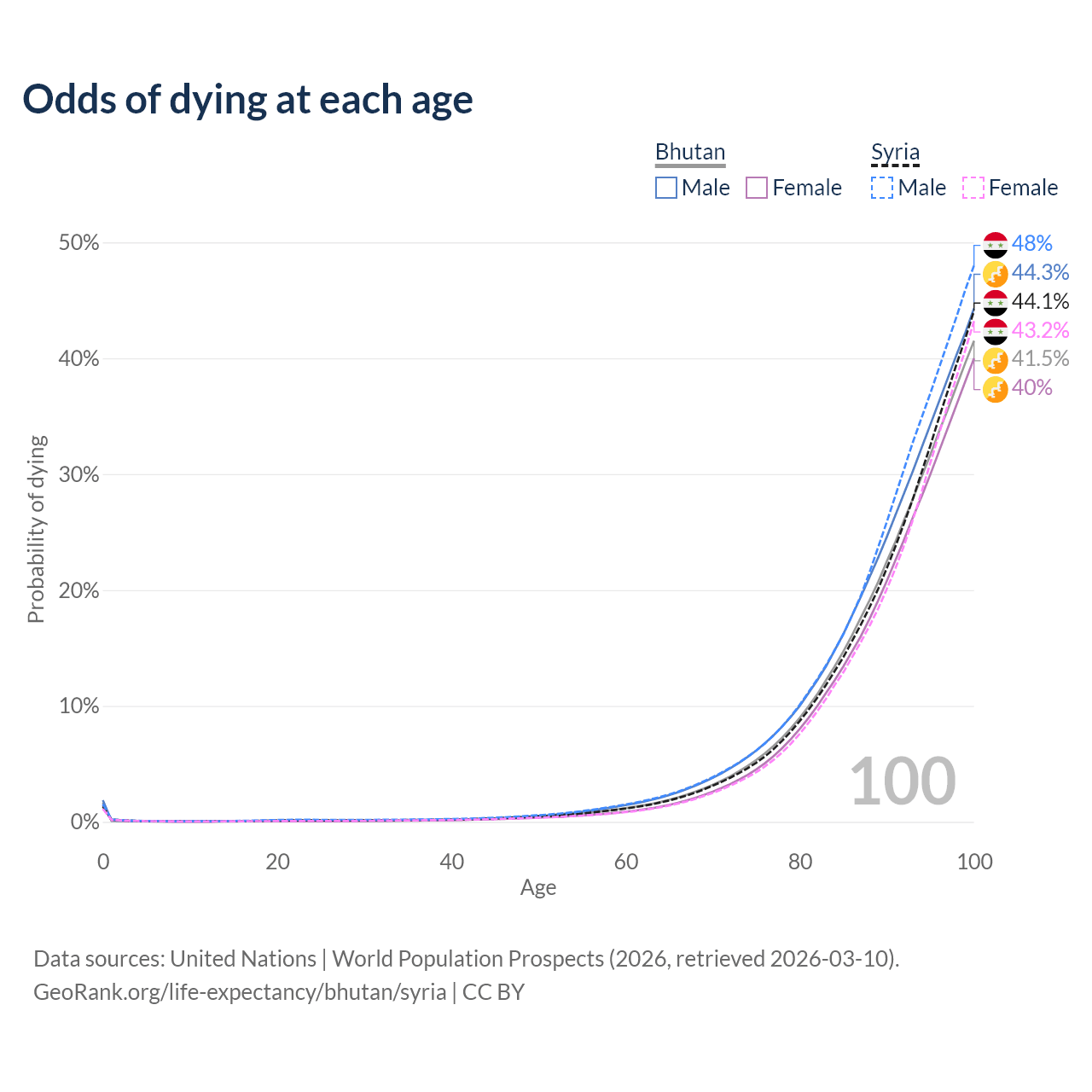 This life expectancy calculator shows the odds of living to 100, 95, 90, and below based on current age for both males and females in Bhutan and Syria, along with mean and median age of death. The calculations are based on the 2026 life tables (actuarial tables) from the UN World Population Prospects.