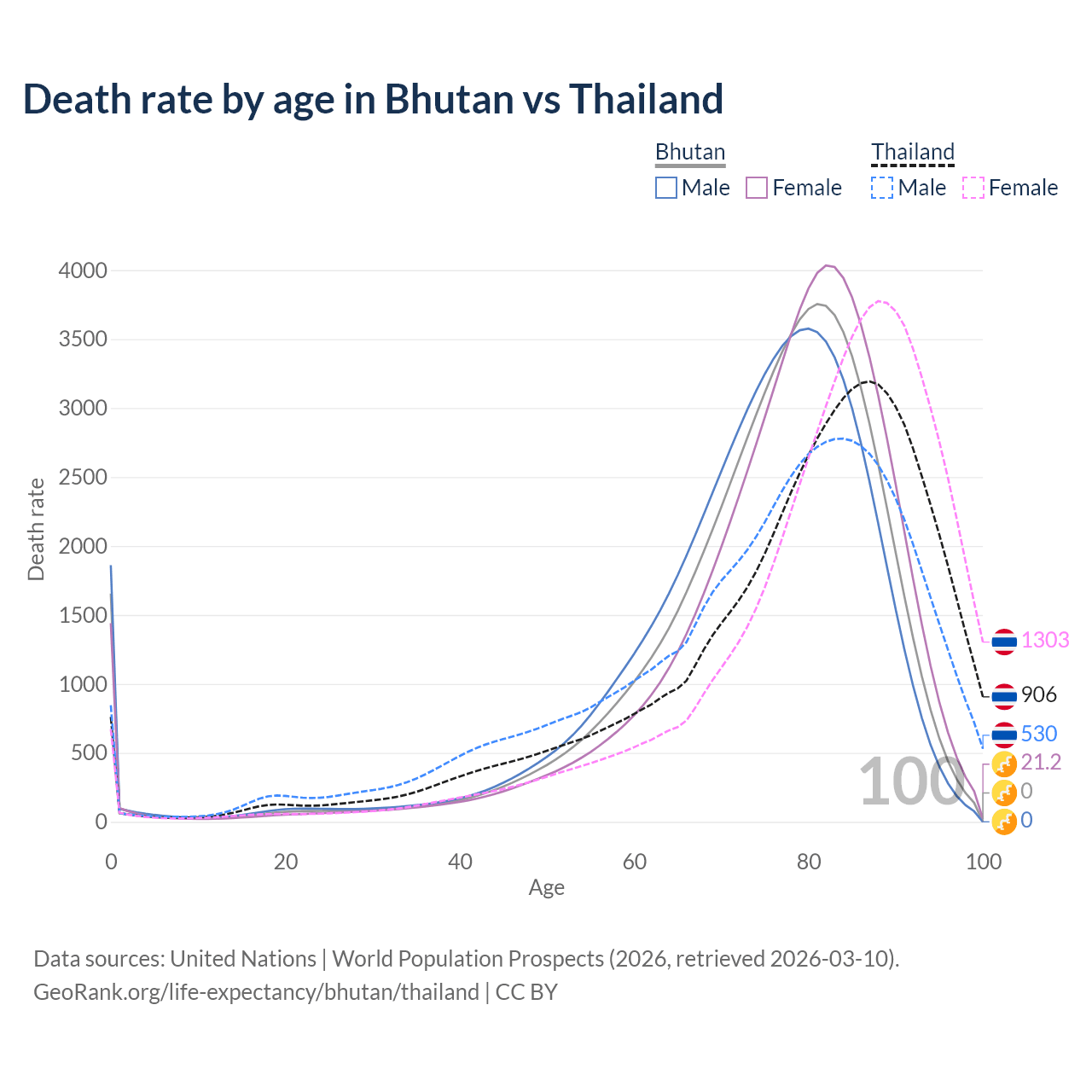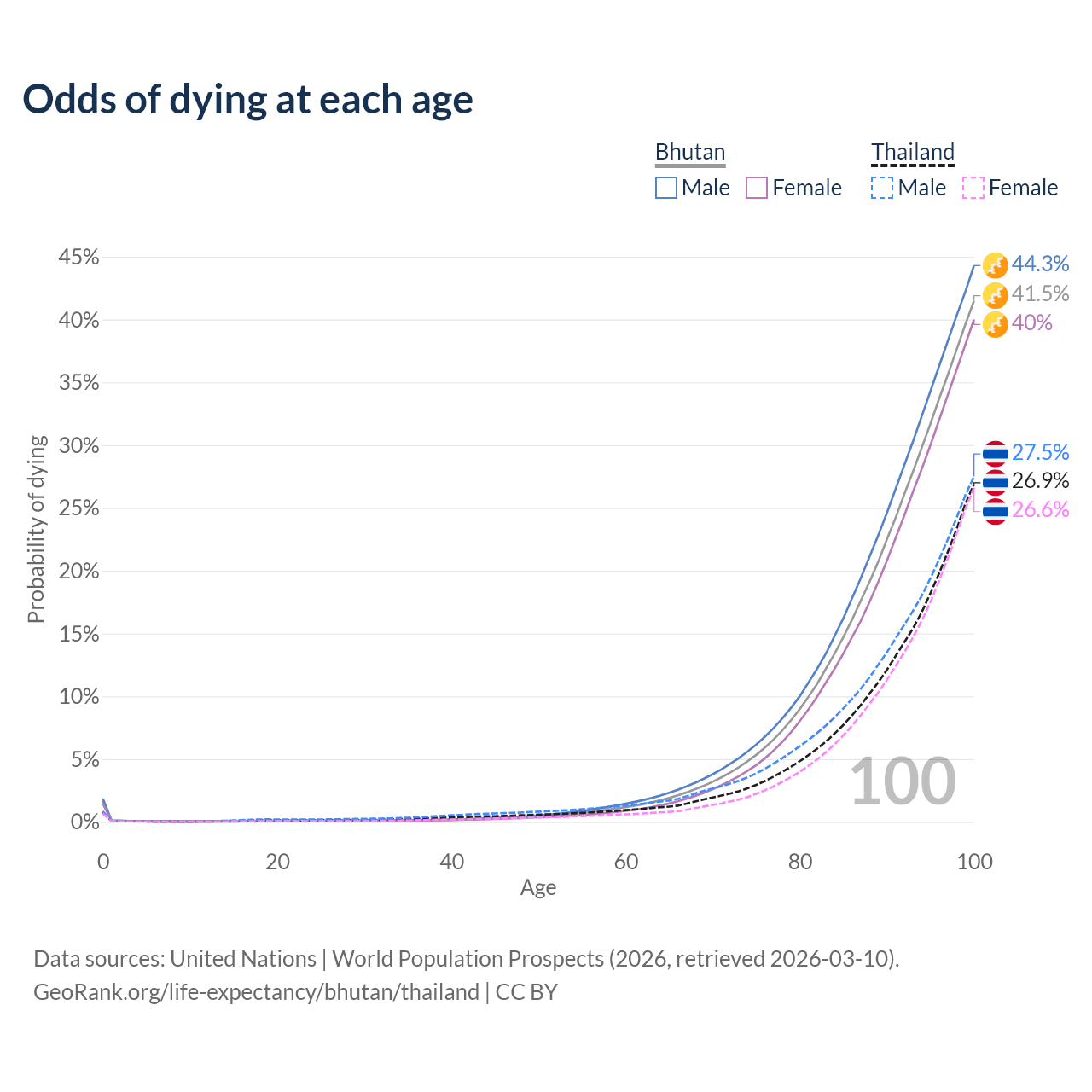 This life expectancy calculator shows the odds of living to 100, 95, 90, and below based on current age for both males and females in Bhutan and Thailand, along with mean and median age of death. The calculations are based on the 2026 life tables (actuarial tables) from the UN World Population Prospects.