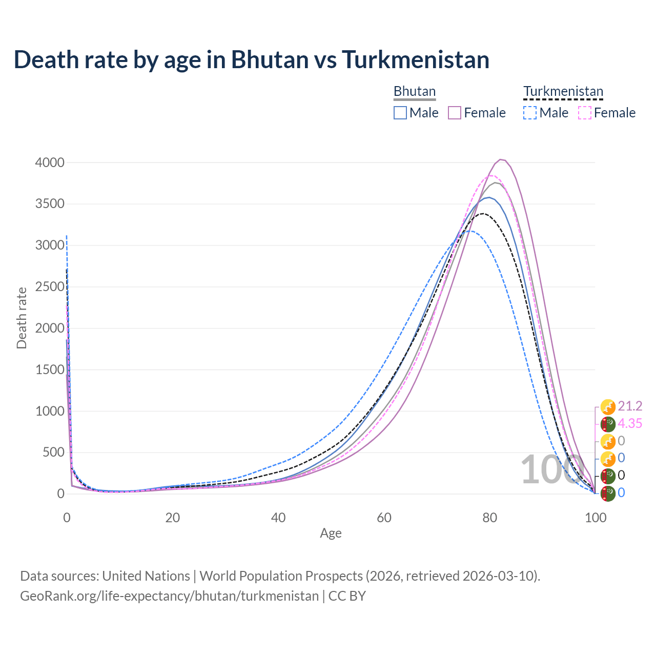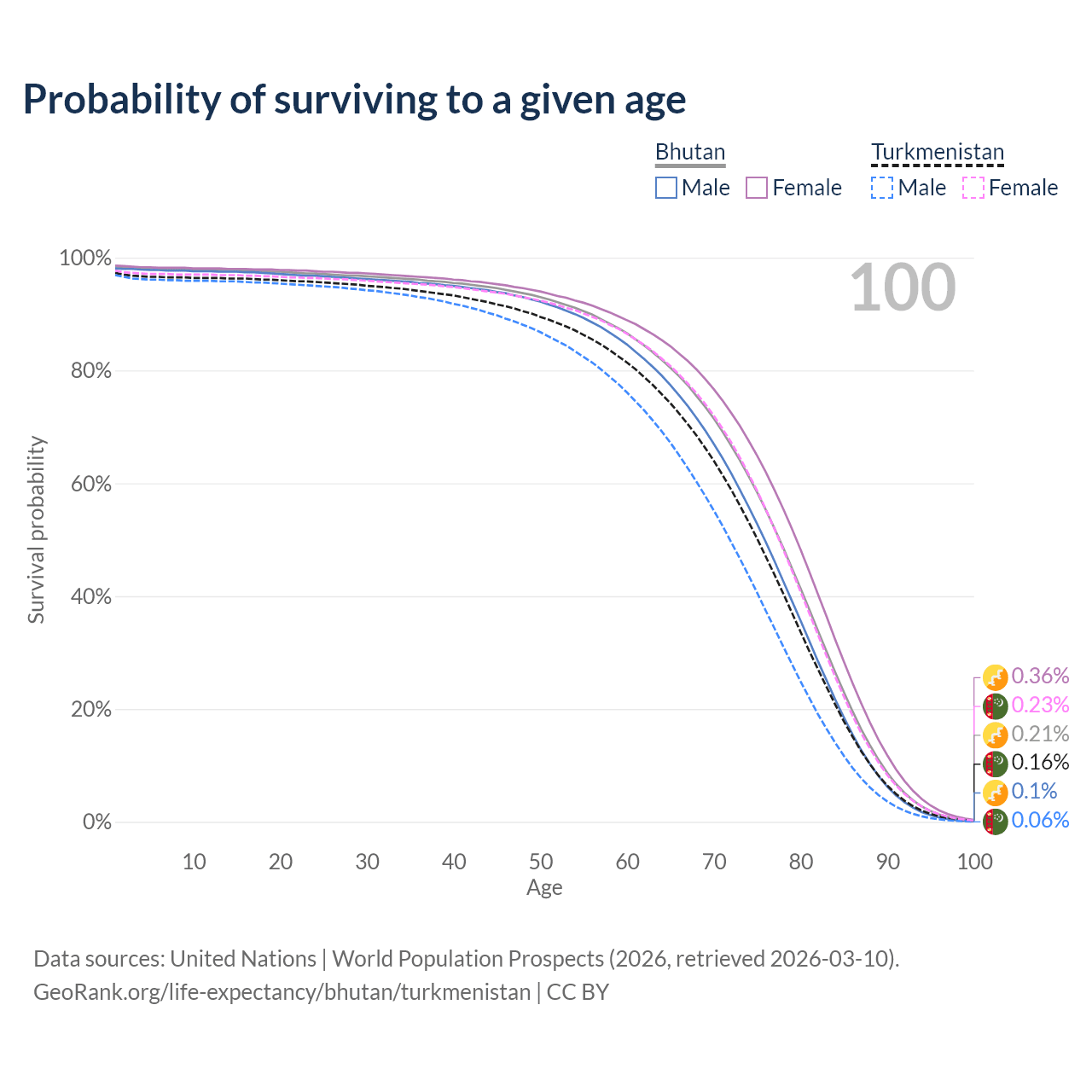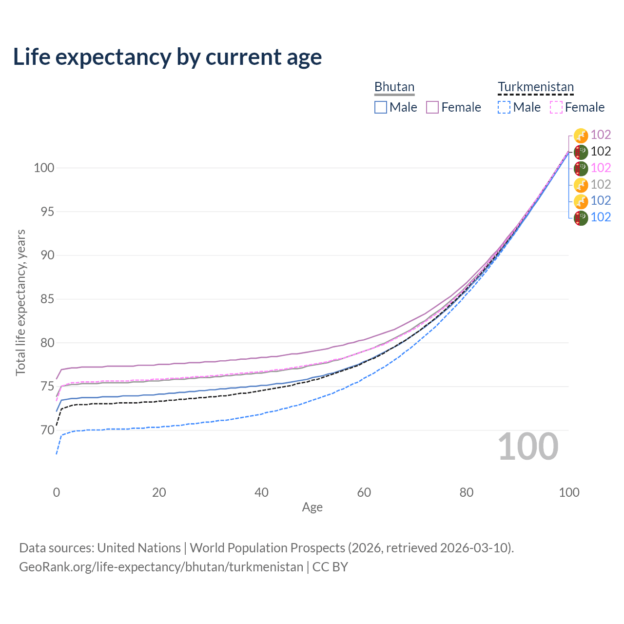 This life expectancy calculator shows the odds of living to 100, 95, 90, and below based on current age for both males and females in Bhutan and Turkmenistan, along with mean and median age of death. The calculations are based on the 2026 life tables (actuarial tables) from the UN World Population Prospects.