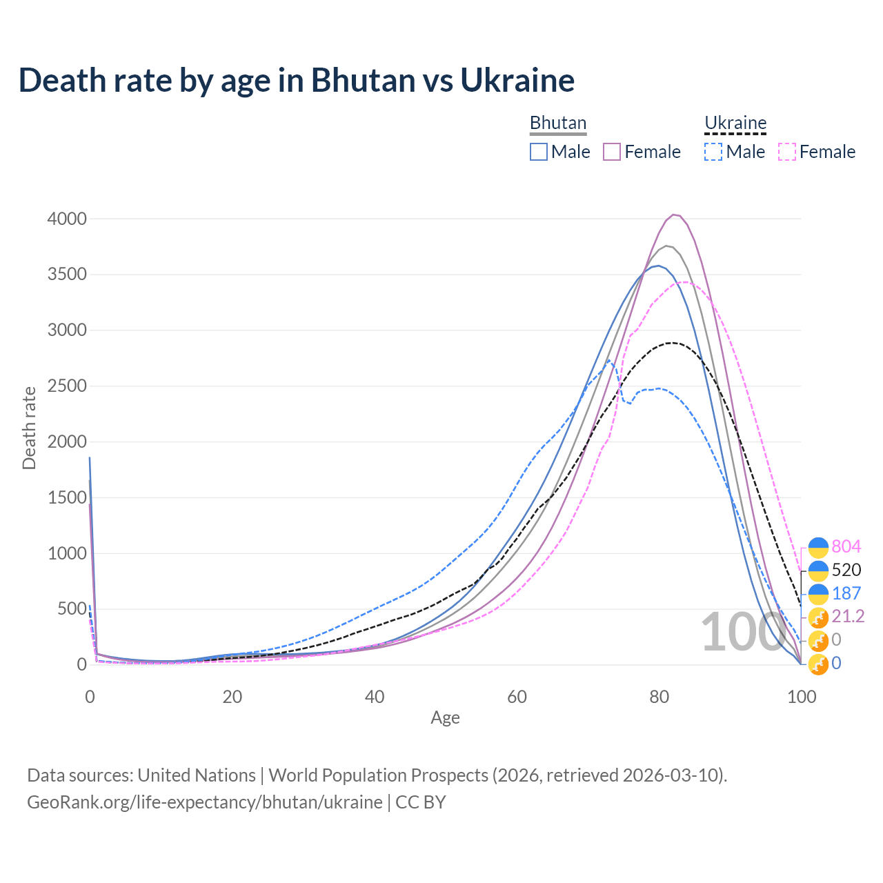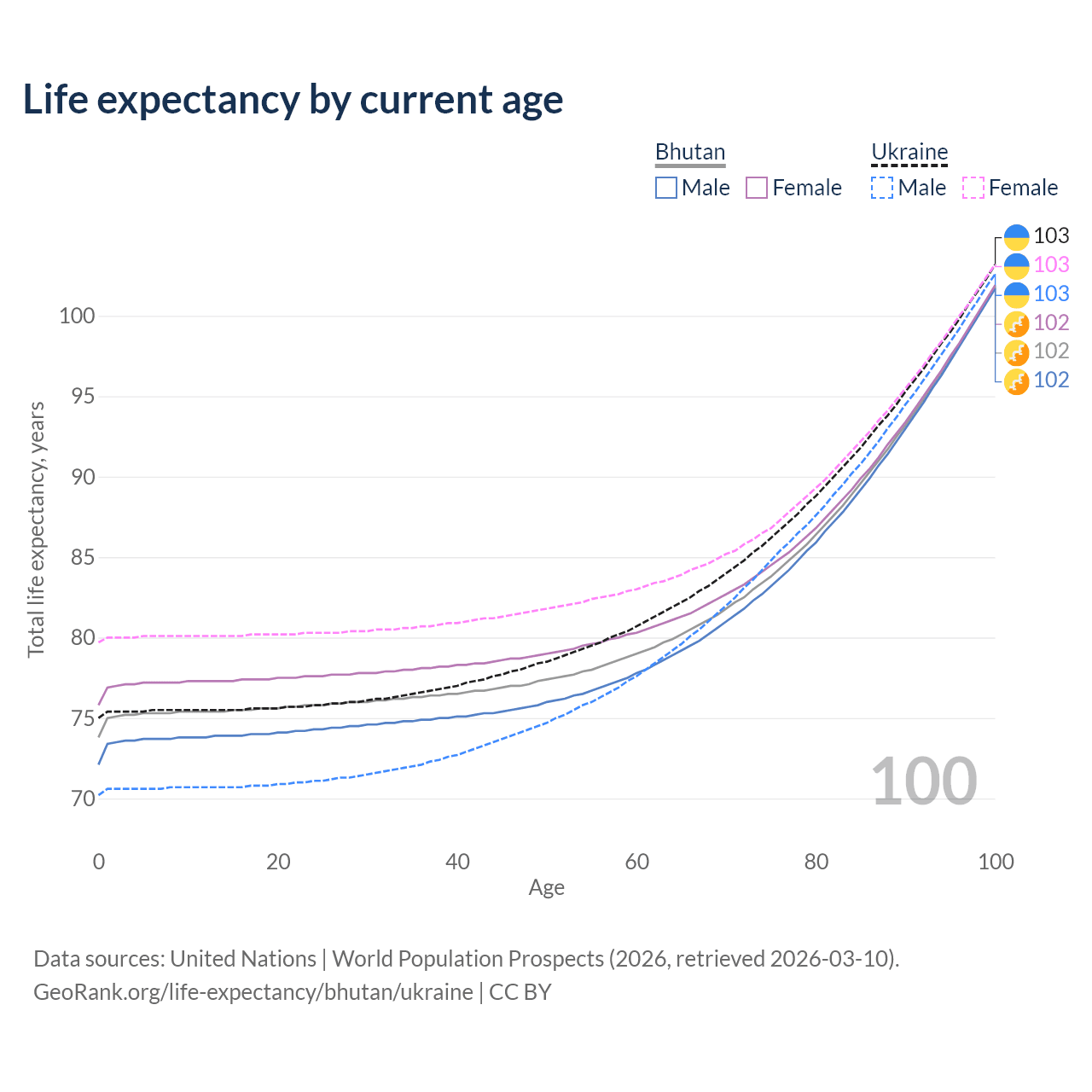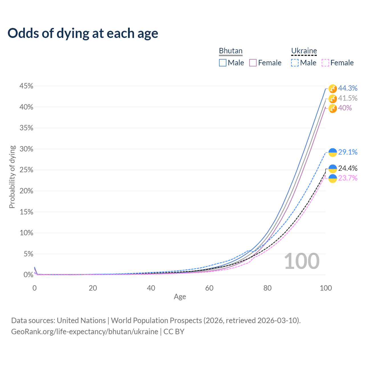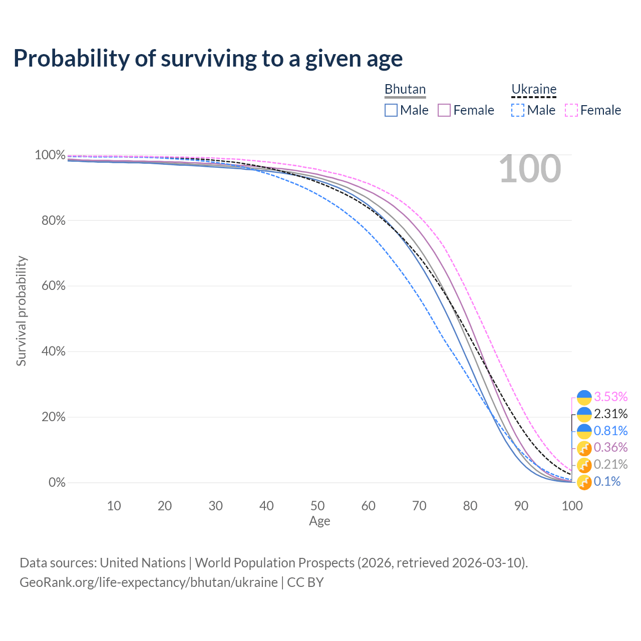This life expectancy calculator shows the odds of living to 100, 95, 90, and below based on current age for both males and females in Bhutan and Ukraine, along with mean and median age of death. The calculations are based on the 2026 life tables (actuarial tables) from the UN World Population Prospects.