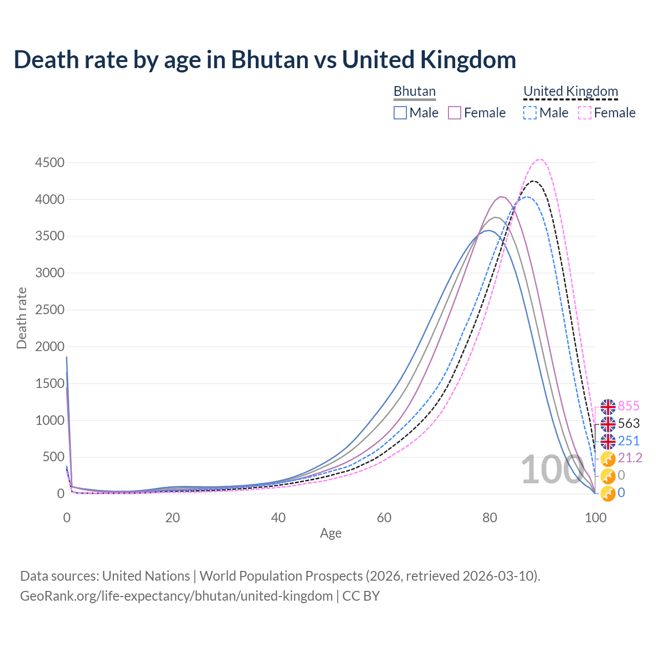 In Bhutan, the most common age of death is 81, compared to 88 in the United Kingdom. The median age of death is 77.6 in Bhutan and 84.9 in the United Kingdom, meaning only half of each cohort is expected to live past that age.