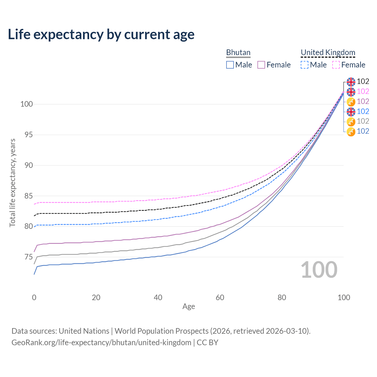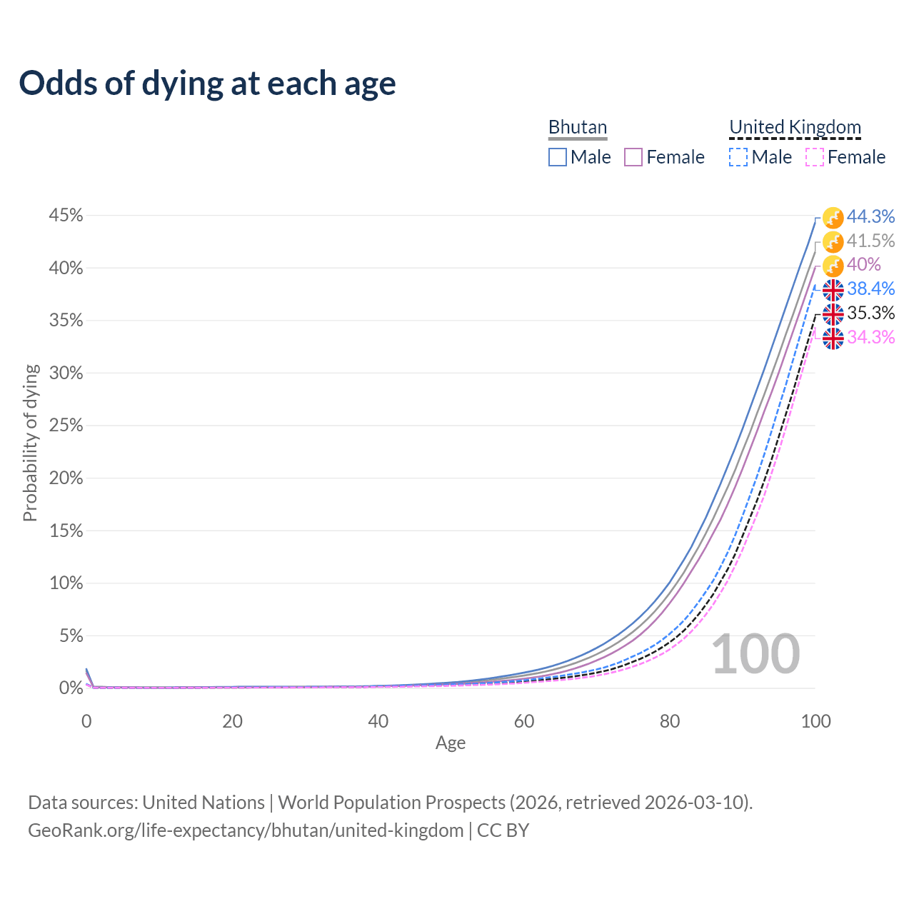 This life expectancy calculator shows the odds of living to 100, 95, 90, and below based on current age for both males and females in Bhutan and the United Kingdom, along with mean and median age of death. The calculations are based on the 2026 life tables (actuarial tables) from the UN World Population Prospects.