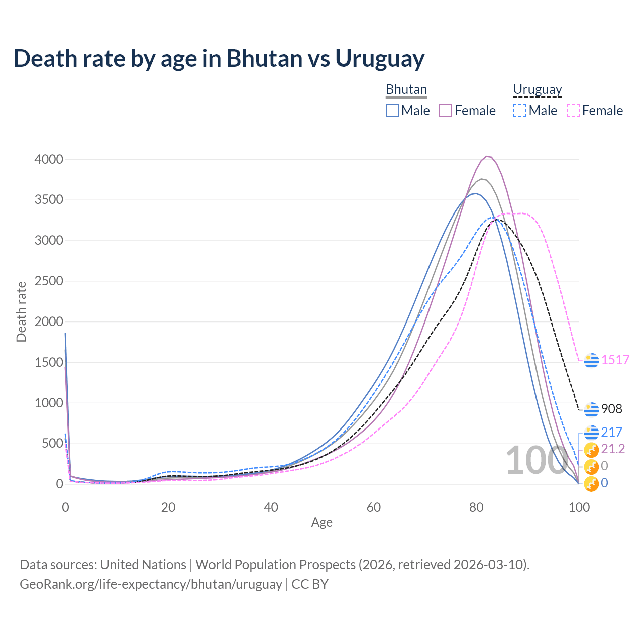 In Bhutan, the most common age of death is 81, compared to 84 in Uruguay. The median age of death is 77.6 in Bhutan and 81.8 in Uruguay, meaning only half of each cohort is expected to live past that age.