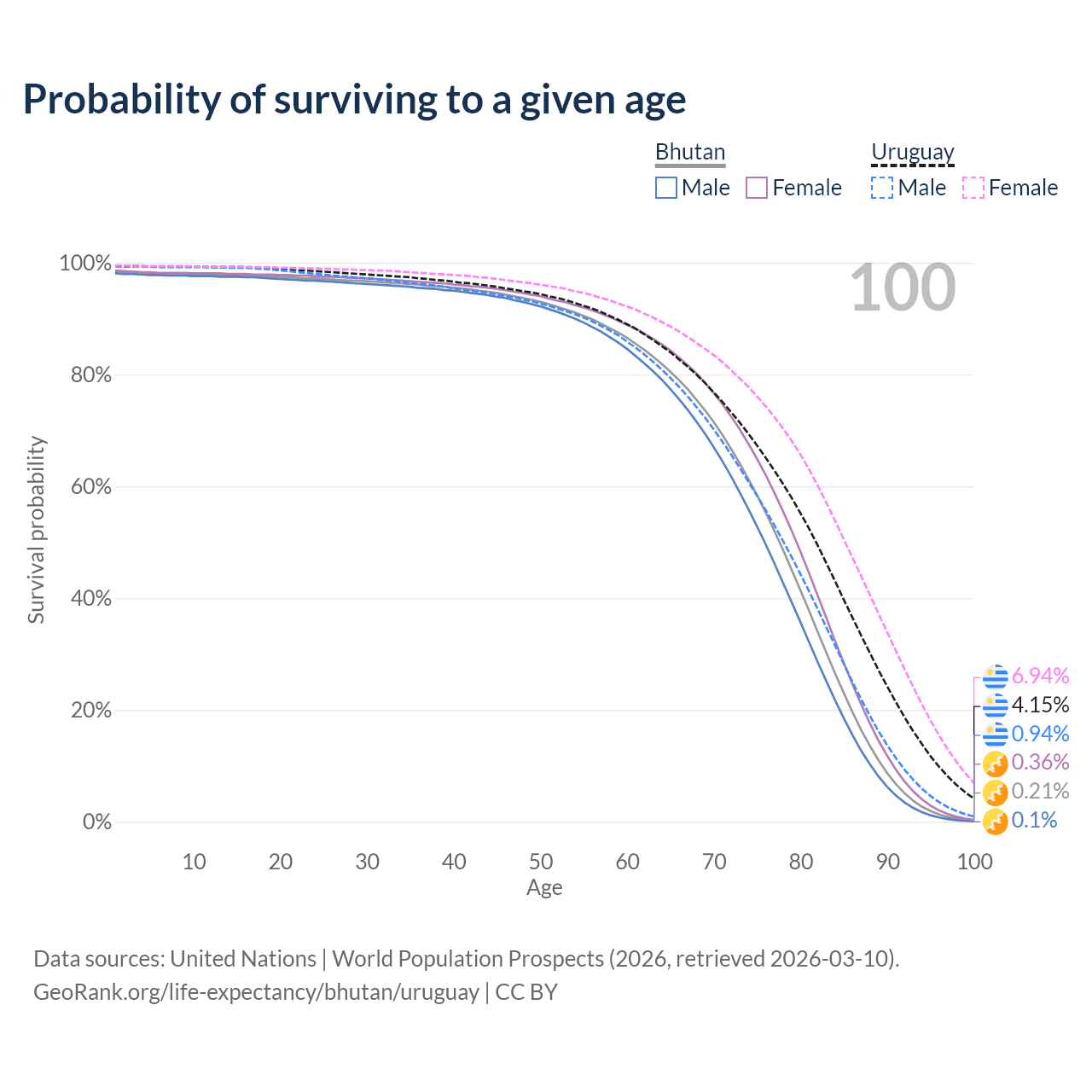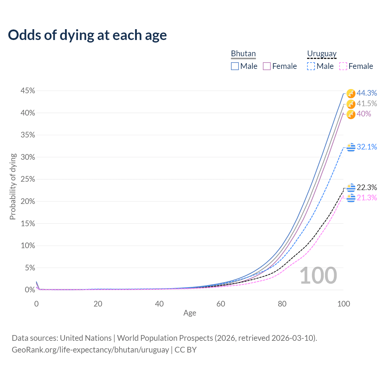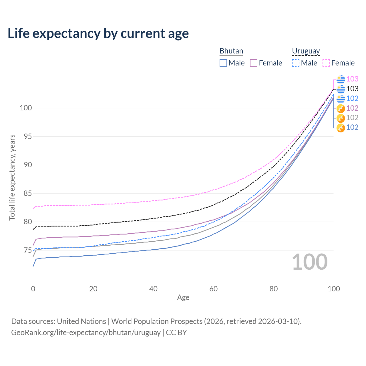 This life expectancy calculator shows the odds of living to 100, 95, 90, and below based on current age for both males and females in Bhutan and Uruguay, along with mean and median age of death. The calculations are based on the 2026 life tables (actuarial tables) from the UN World Population Prospects.