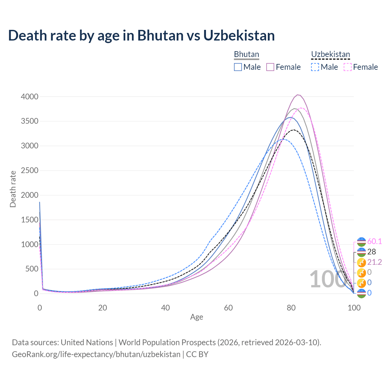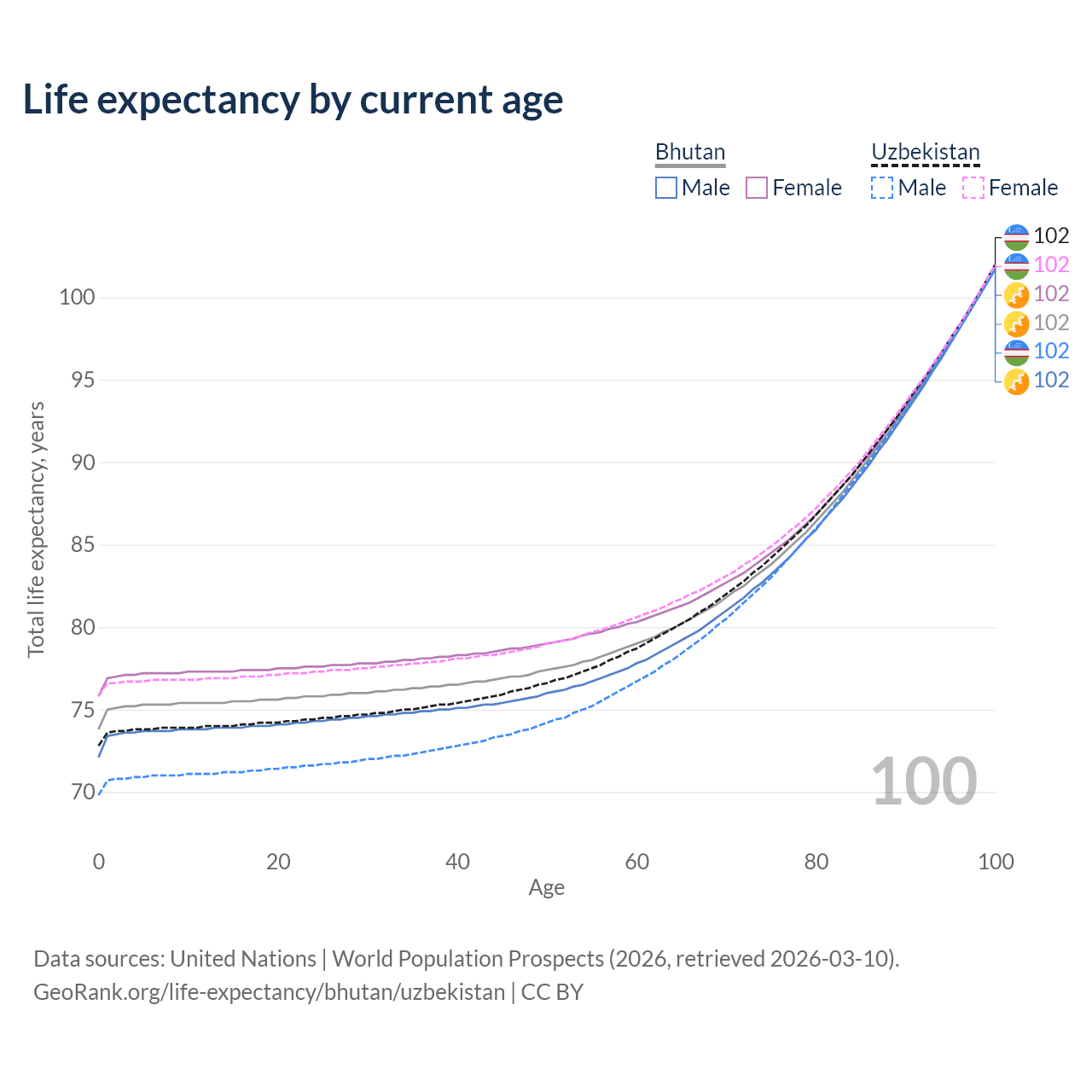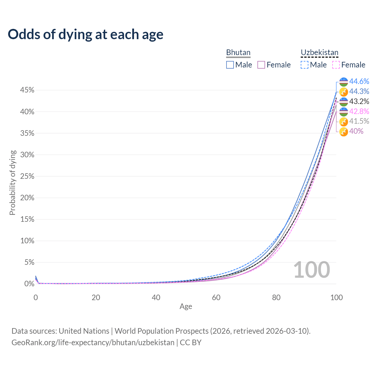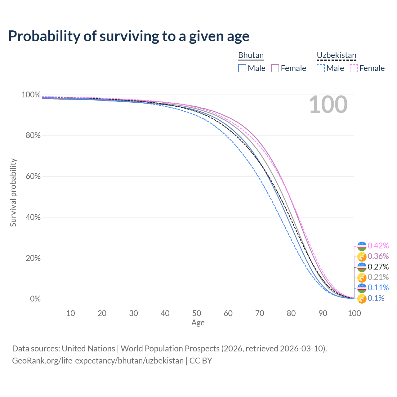 This life expectancy calculator shows the odds of living to 100, 95, 90, and below based on current age for both males and females in Bhutan and Uzbekistan, along with mean and median age of death. The calculations are based on the 2026 life tables (actuarial tables) from the UN World Population Prospects.
