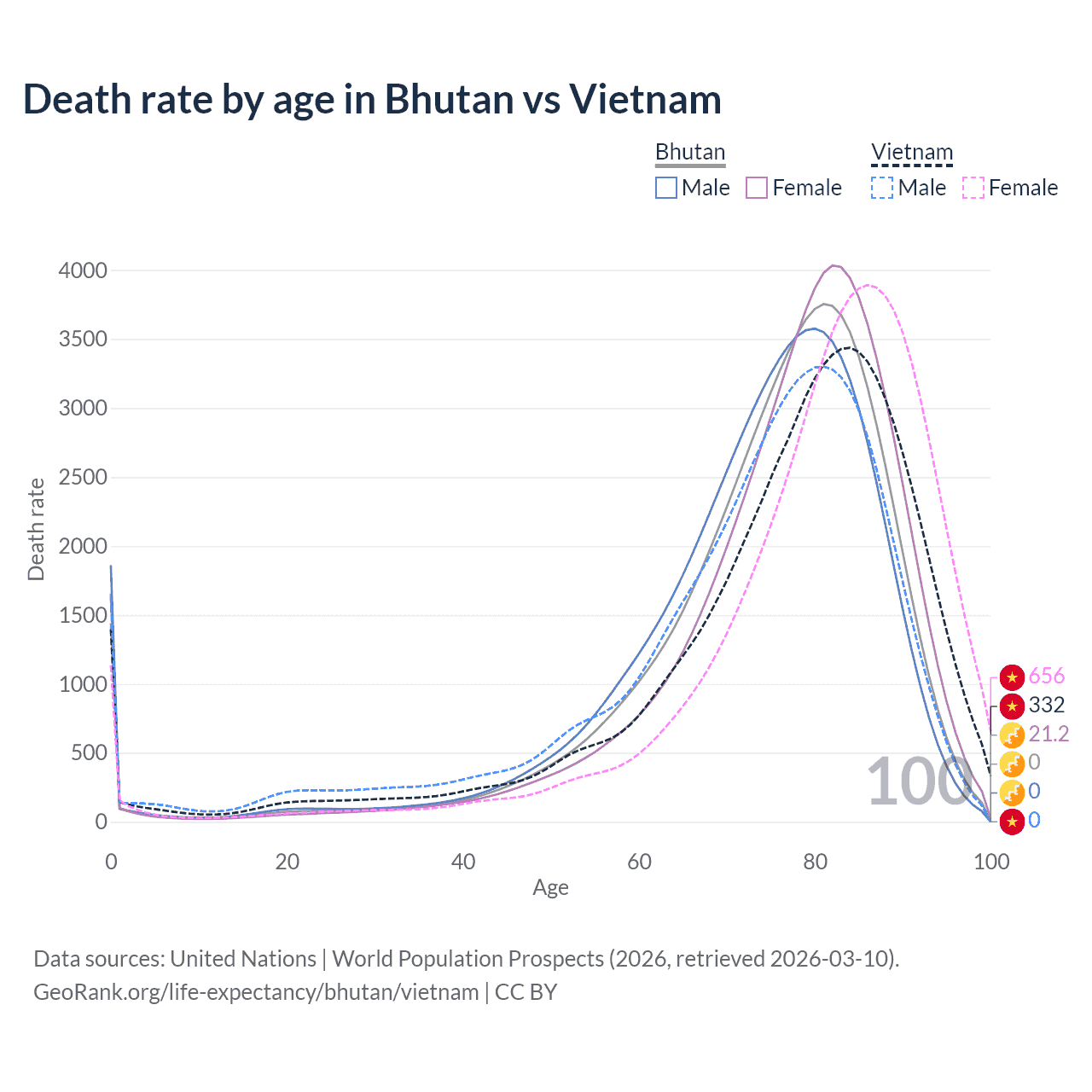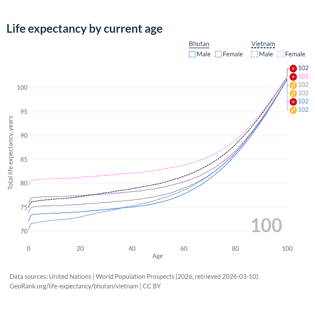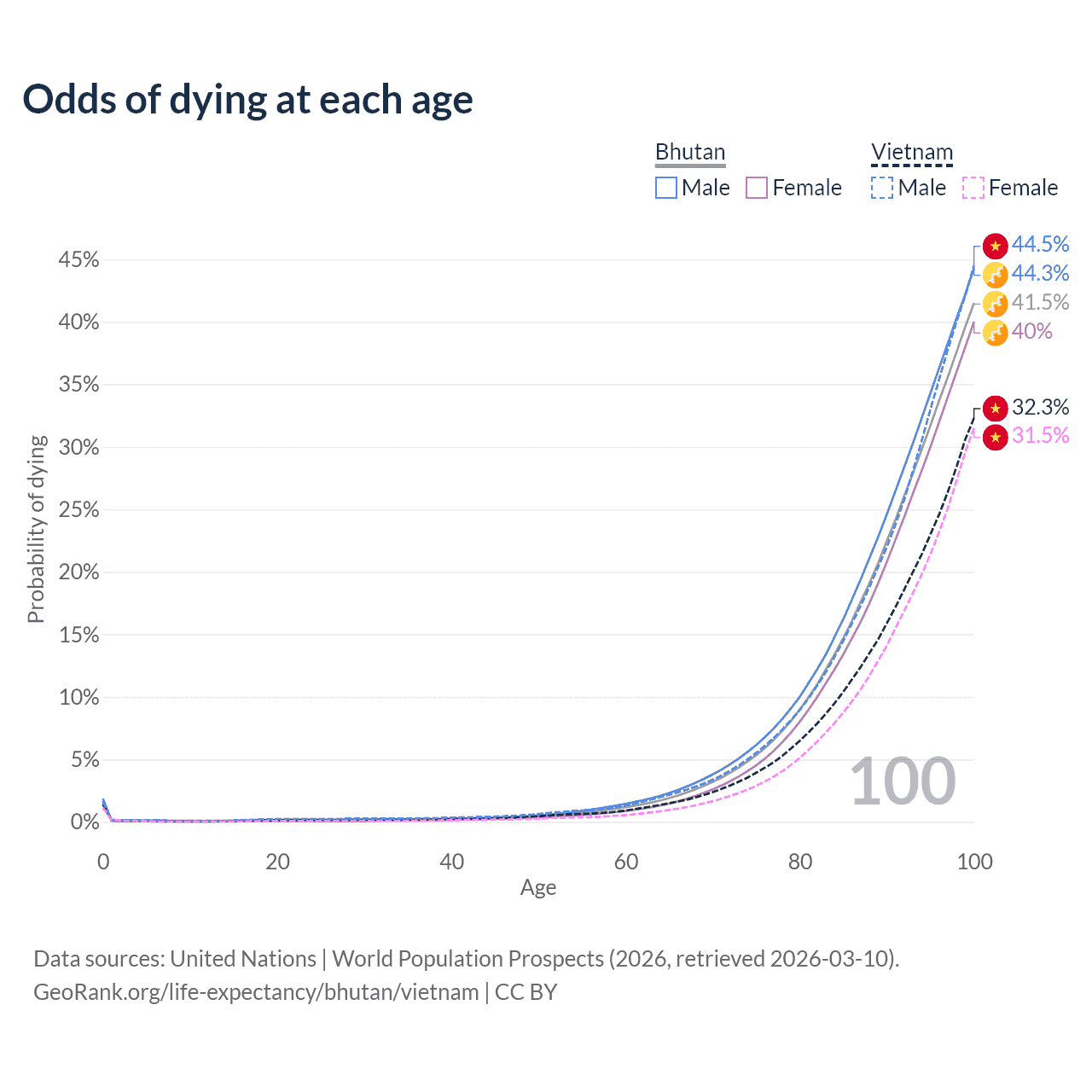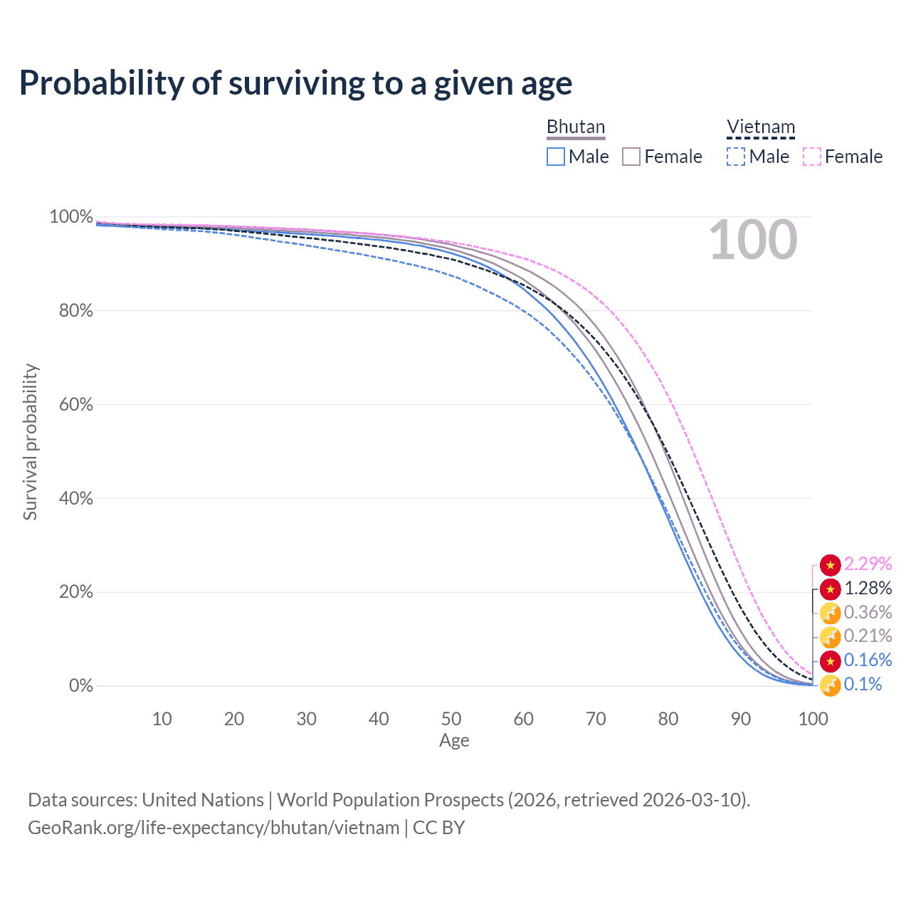 This life expectancy calculator shows the odds of living to 100, 95, 90, and below based on current age for both males and females in Bhutan and Vietnam, along with mean and median age of death. The calculations are based on the 2026 life tables (actuarial tables) from the UN World Population Prospects.