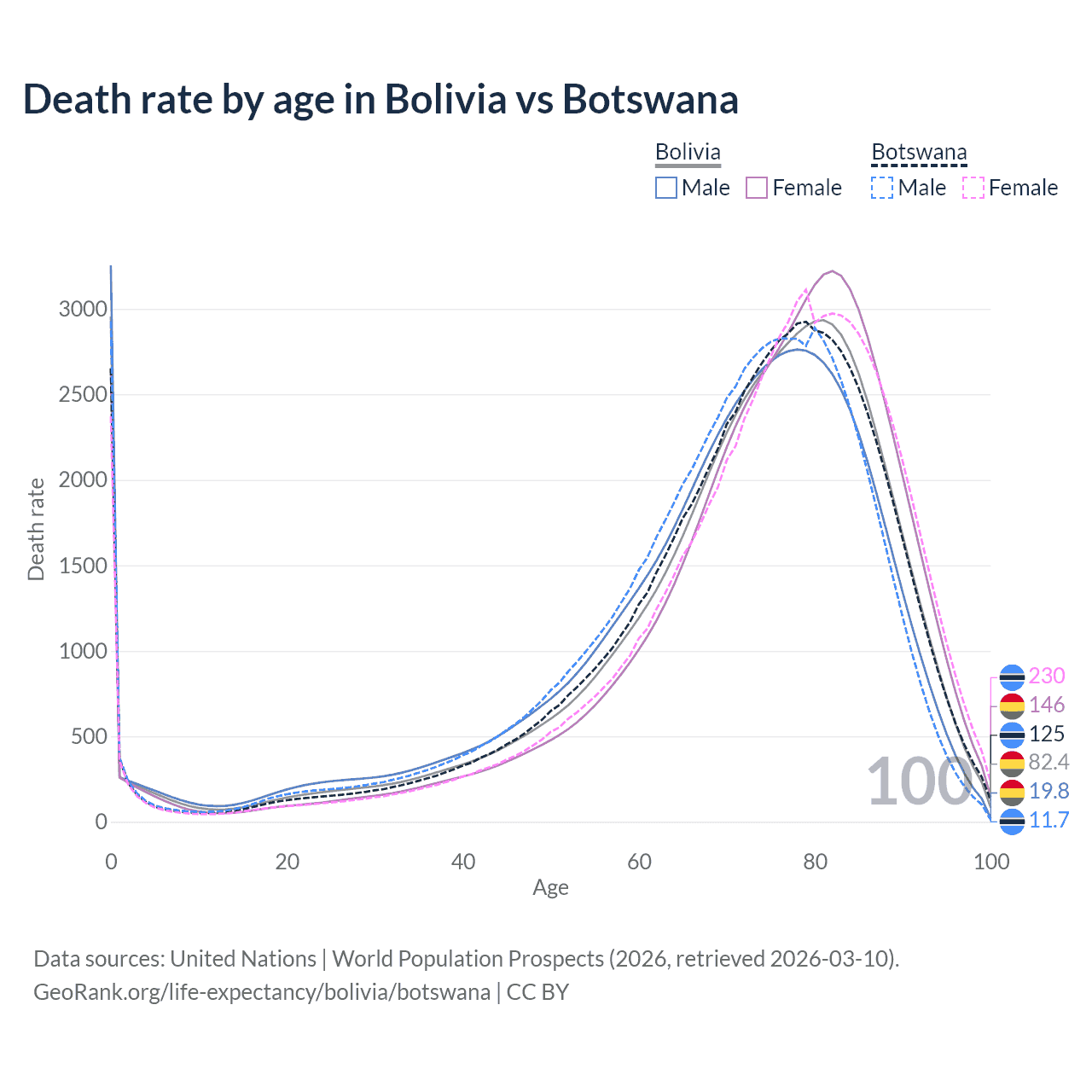 In Bolivia, the most common age of death is 0, compared to 79 in Botswana. The median age of death is 74.5 in Bolivia and 74.4 in Botswana, meaning only half of each cohort is expected to live past that age.