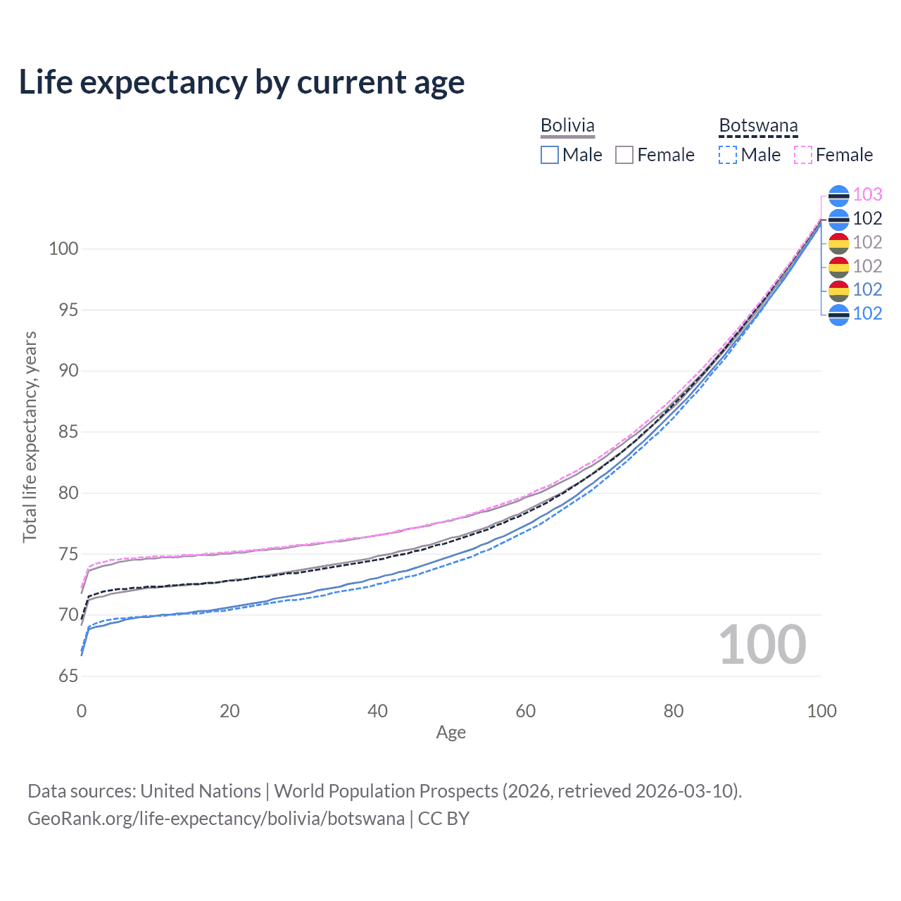 This life expectancy calculator shows the odds of living to 100, 95, 90, and below based on current age for both males and females in Bolivia and Botswana, along with mean and median age of death. The calculations are based on the 2026 life tables (actuarial tables) from the UN World Population Prospects.