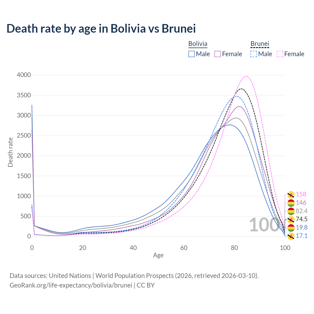 In Bolivia, the most common age of death is 0, compared to 83 in Brunei. The median age of death is 74.5 in Bolivia and 79.2 in Brunei, meaning only half of each cohort is expected to live past that age.