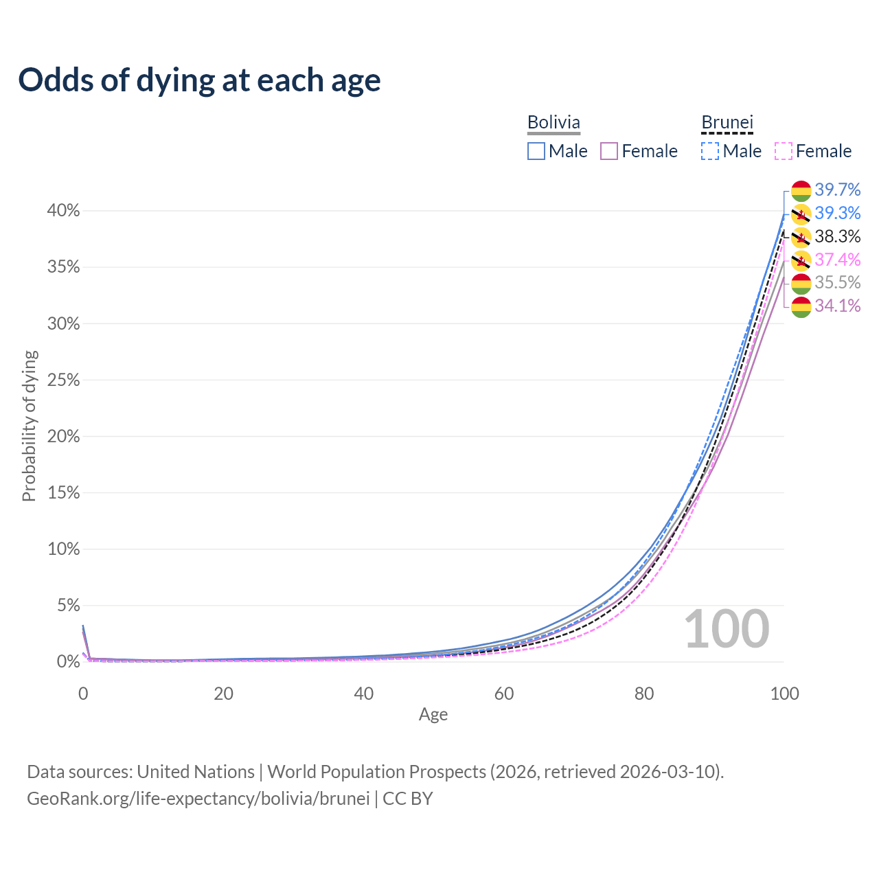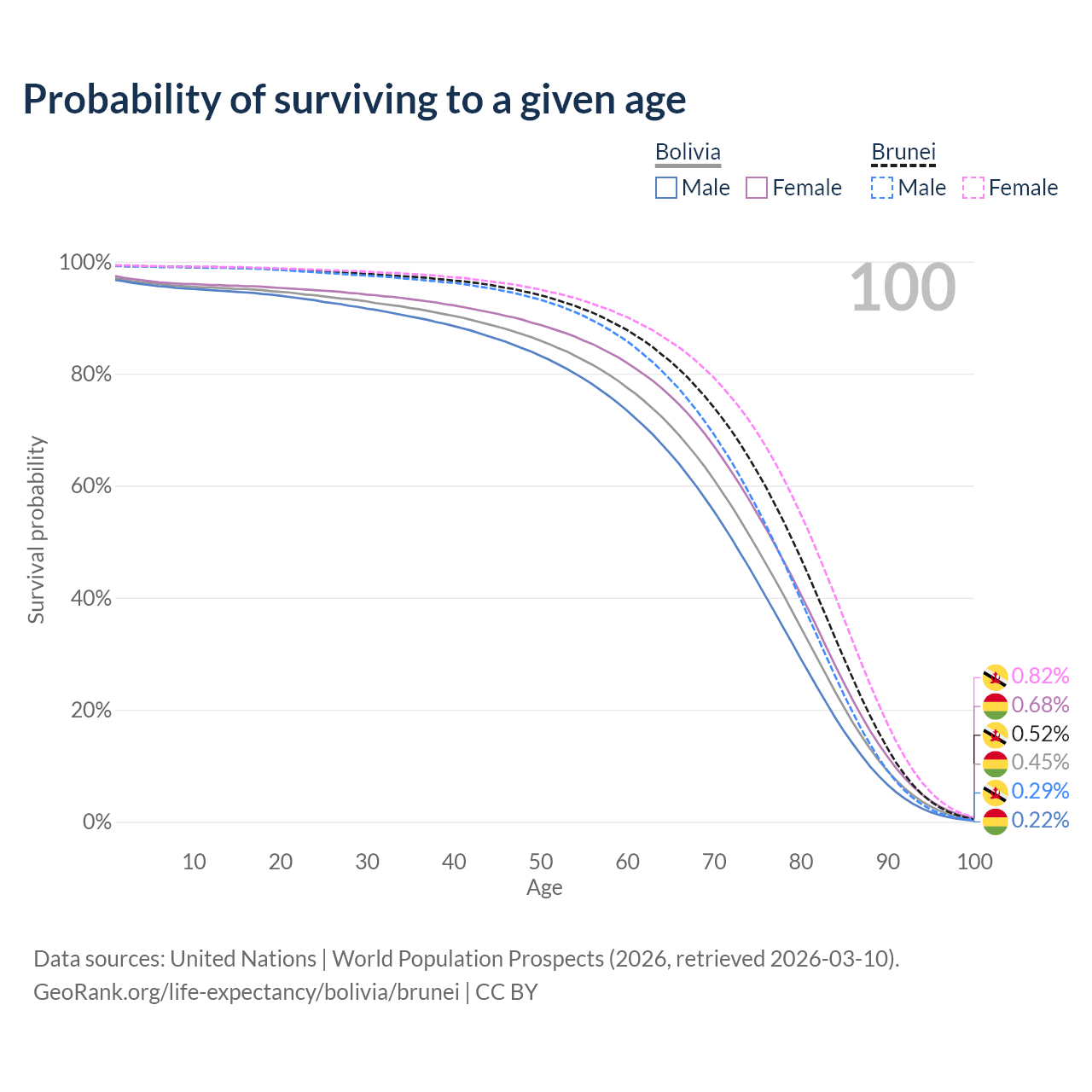 This life expectancy calculator shows the odds of living to 100, 95, 90, and below based on current age for both males and females in Bolivia and Brunei, along with mean and median age of death. The calculations are based on the 2026 life tables (actuarial tables) from the UN World Population Prospects.