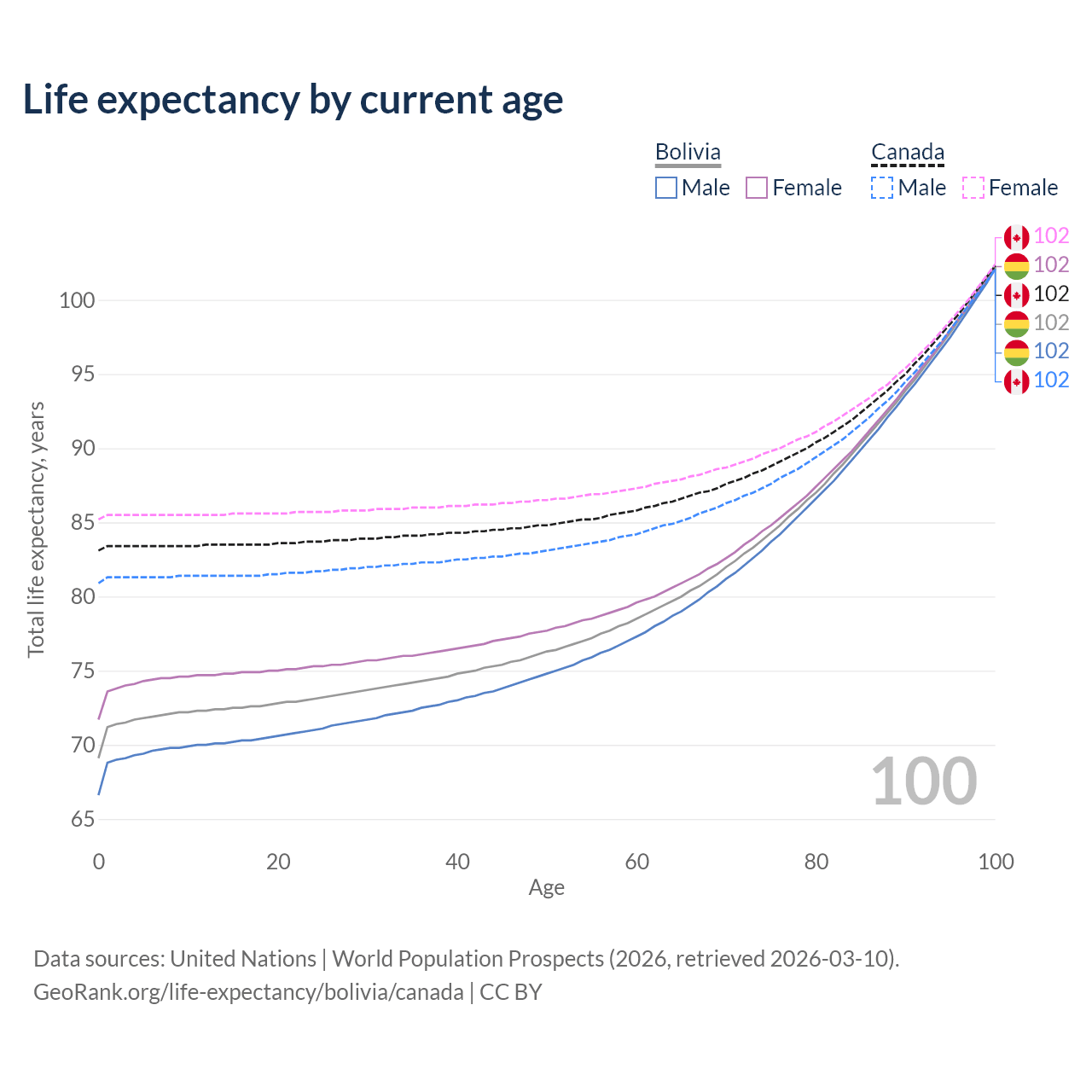 This life expectancy calculator shows the odds of living to 100, 95, 90, and below based on current age for both males and females in Bolivia and Canada, along with mean and median age of death. The calculations are based on the 2026 life tables (actuarial tables) from the UN World Population Prospects.