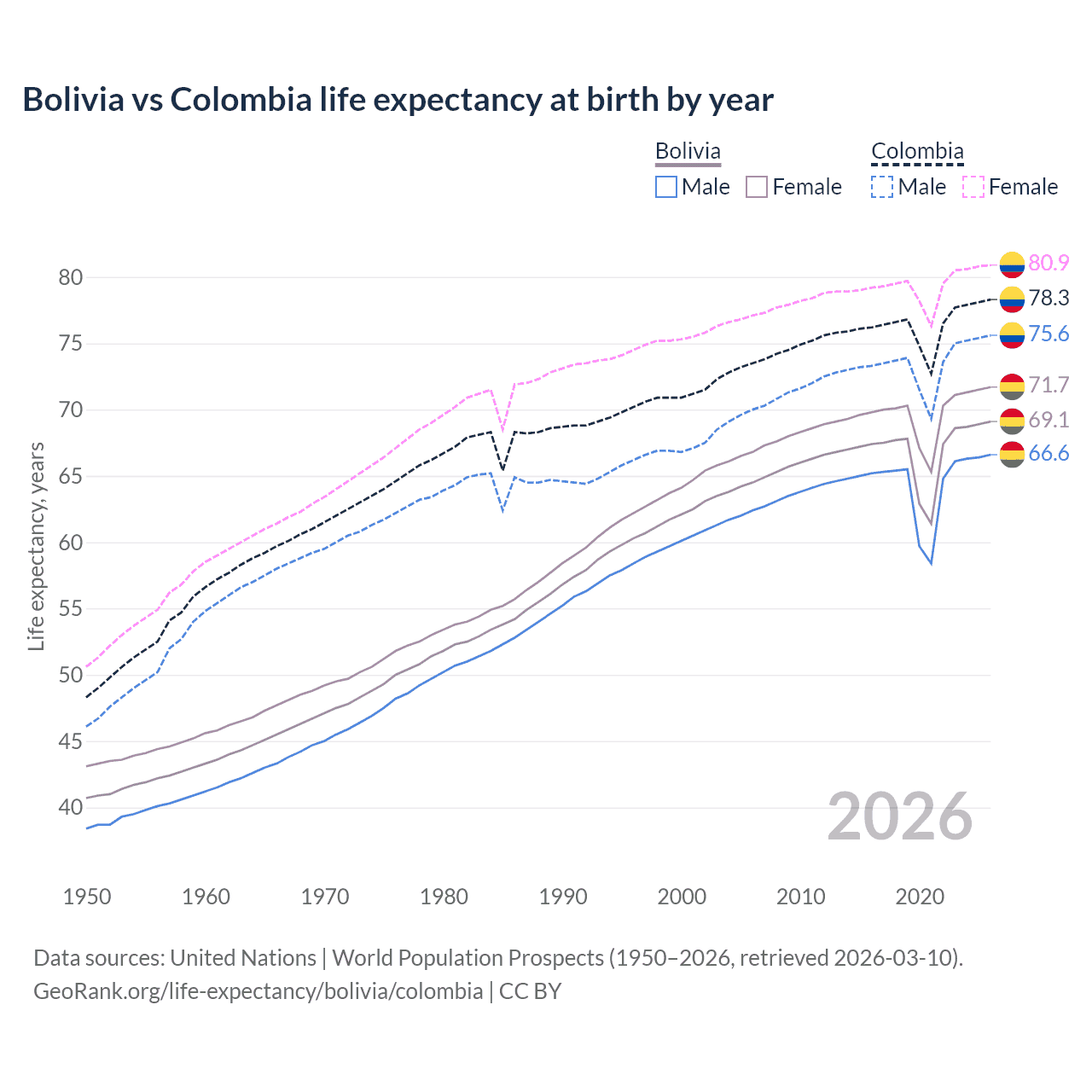 The average life expectancy at birth is 69.1 years in Bolivia vs 78.3 in Colombia. Bolivia is ranked 145/197 by life expectancy, and Colombia is 60/197. In Bolivia, the life expectancy is 66.6 years for males and 71.7 years for females. In Colombia, it's 75.6 years for males and 80.9 years for females.