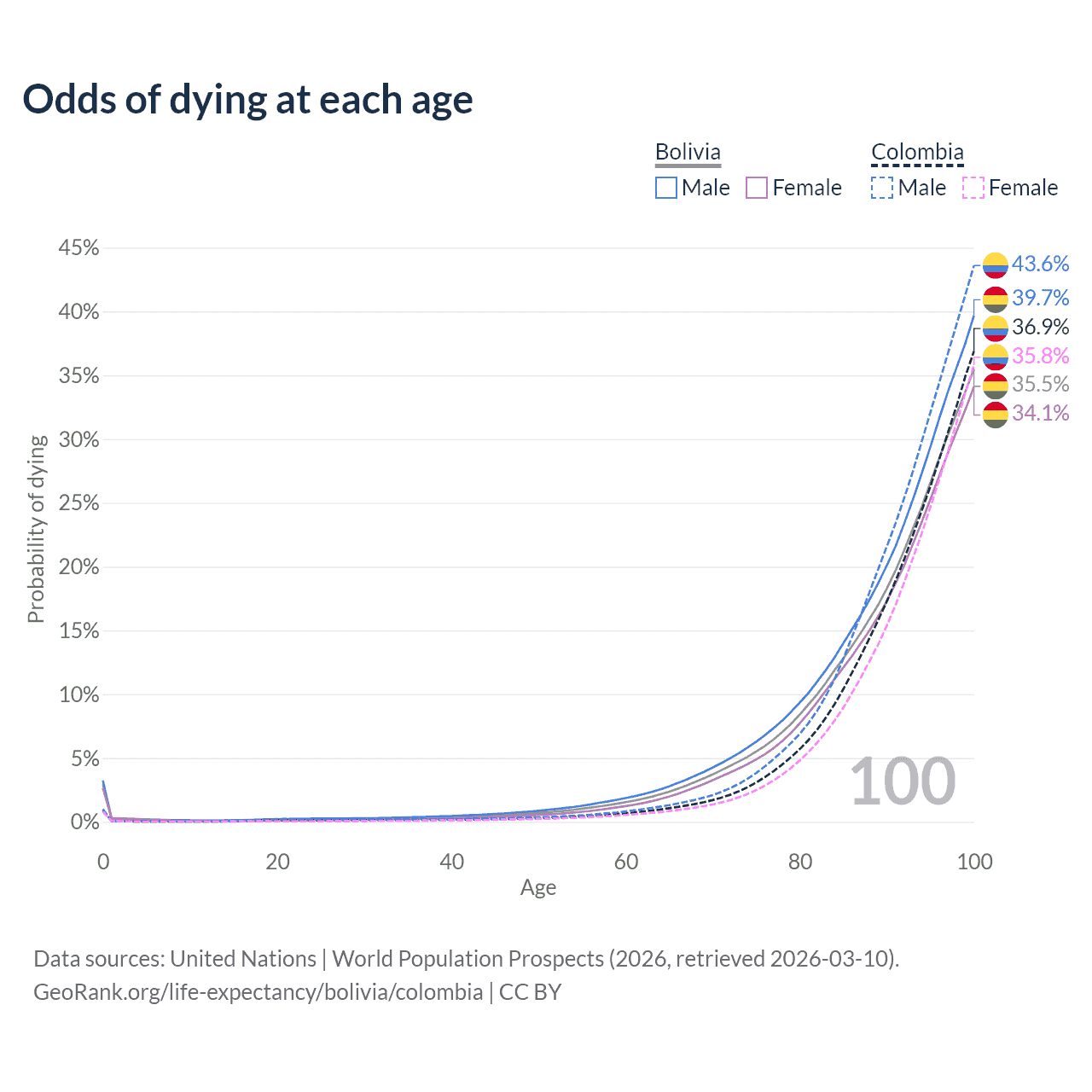 This life expectancy calculator shows the odds of living to 100, 95, 90, and below based on current age for both males and females in Bolivia and Colombia, along with mean and median age of death. The calculations are based on the 2026 life tables (actuarial tables) from the UN World Population Prospects.