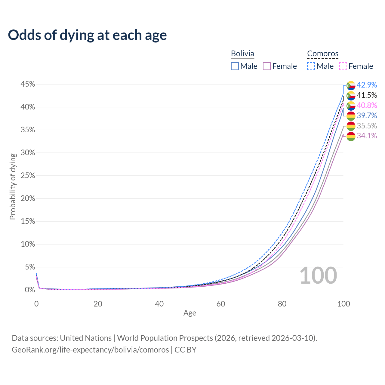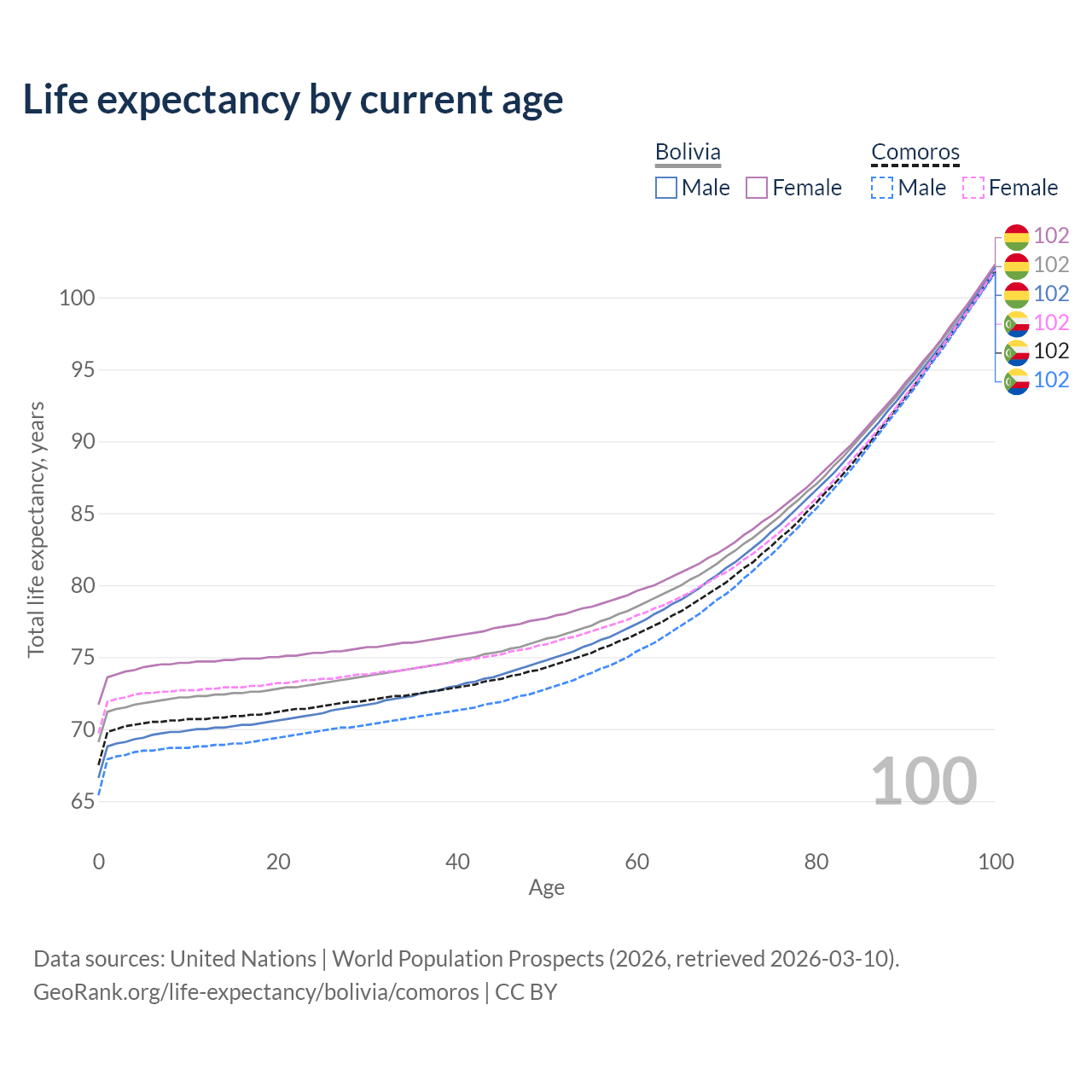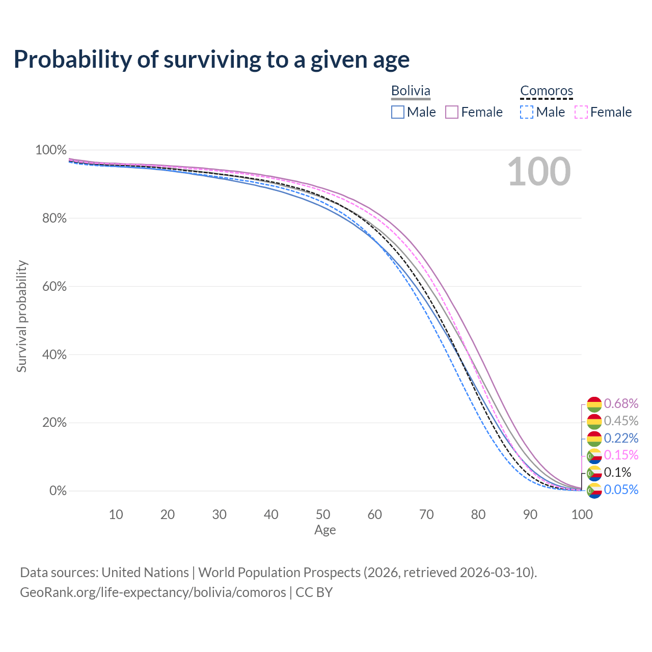 This life expectancy calculator shows the odds of living to 100, 95, 90, and below based on current age for both males and females in Bolivia and Comoros, along with mean and median age of death. The calculations are based on the 2026 life tables (actuarial tables) from the UN World Population Prospects.