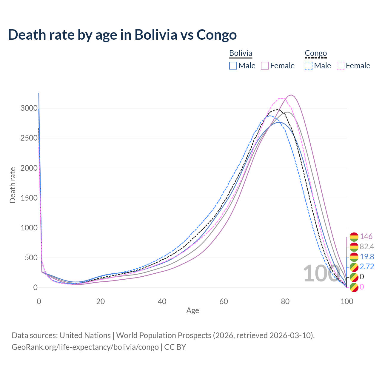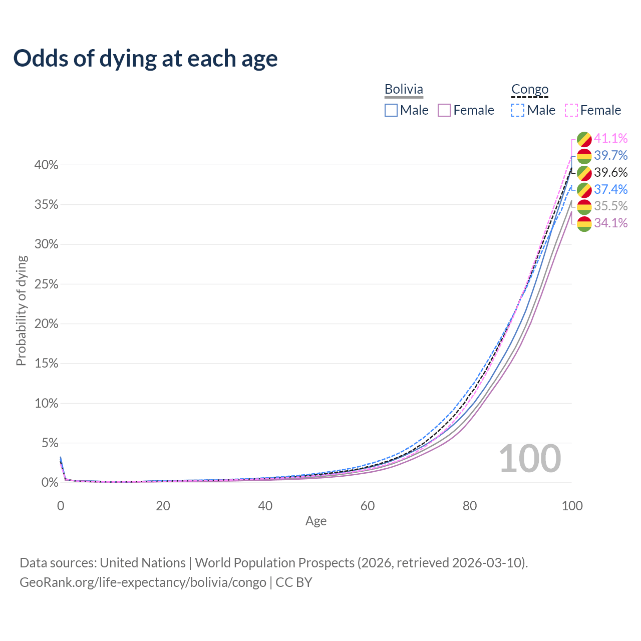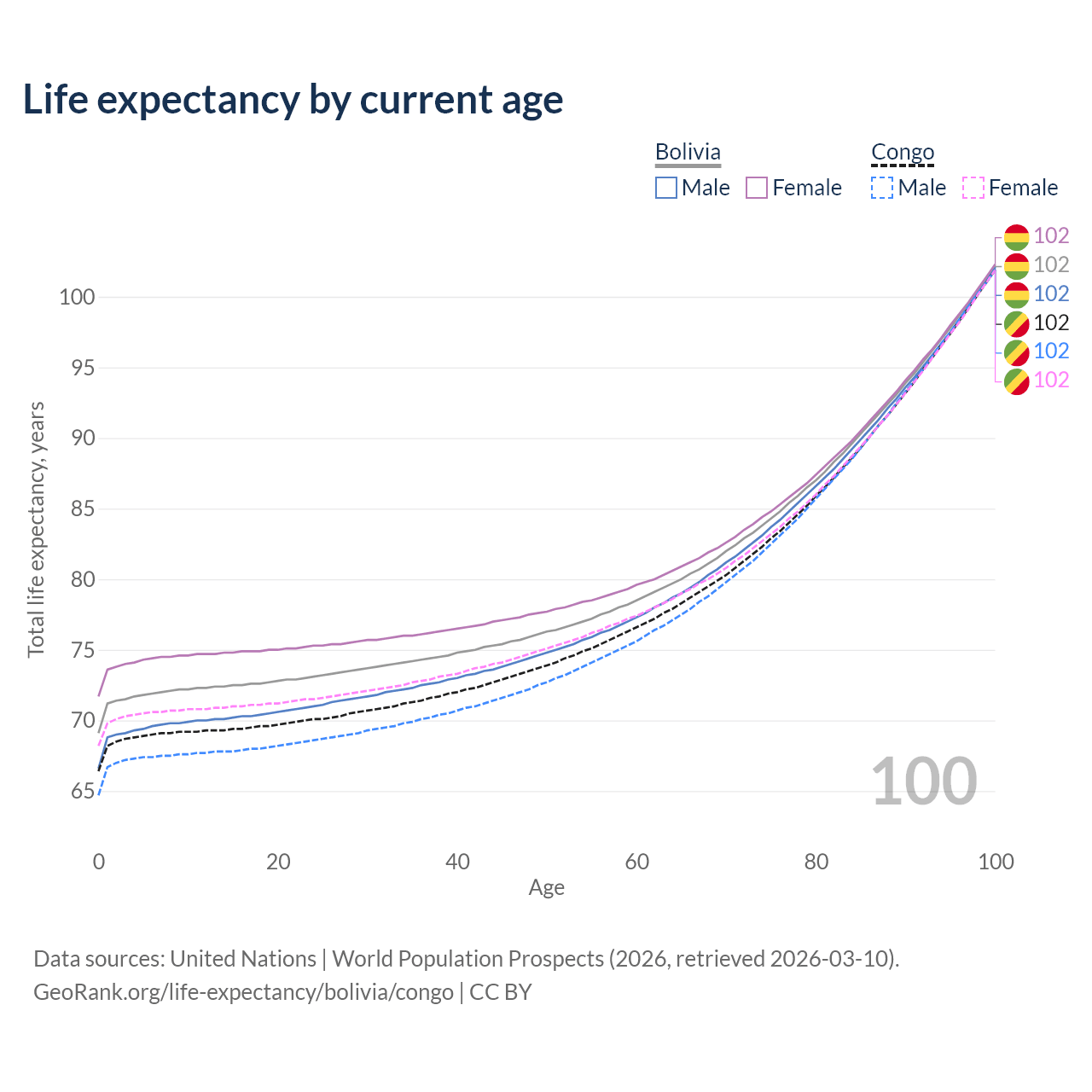 This life expectancy calculator shows the odds of living to 100, 95, 90, and below based on current age for both males and females in Bolivia and the Congo, along with mean and median age of death. The calculations are based on the 2026 life tables (actuarial tables) from the UN World Population Prospects.