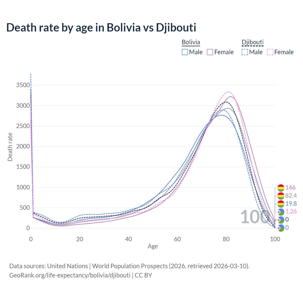 In Bolivia, the most common age of death is 0, compared to 0 in Djibouti. The median age of death is 74.5 in Bolivia and 73.7 in Djibouti, meaning only half of each cohort is expected to live past that age.