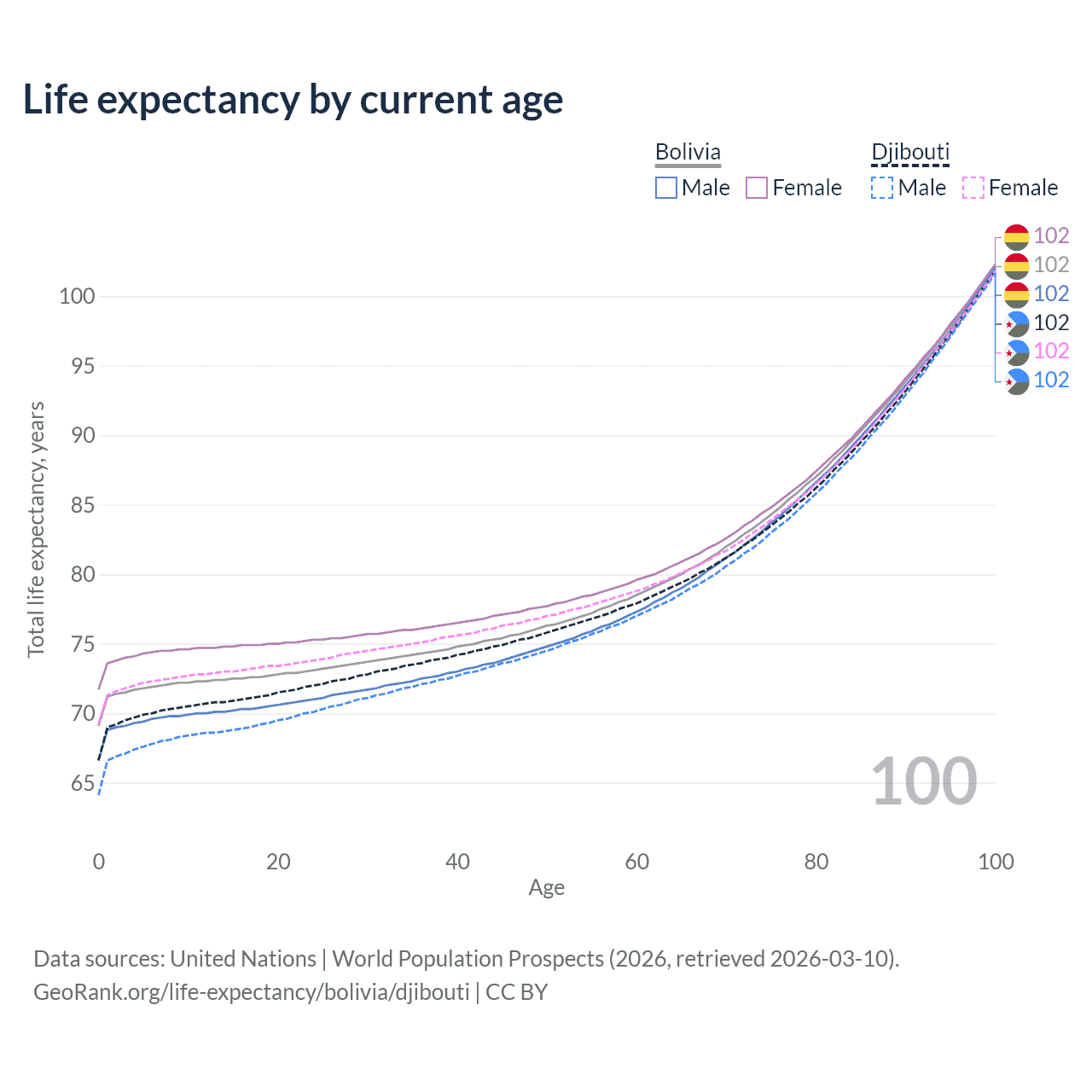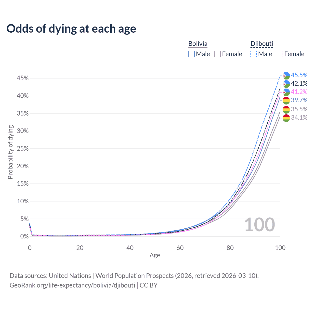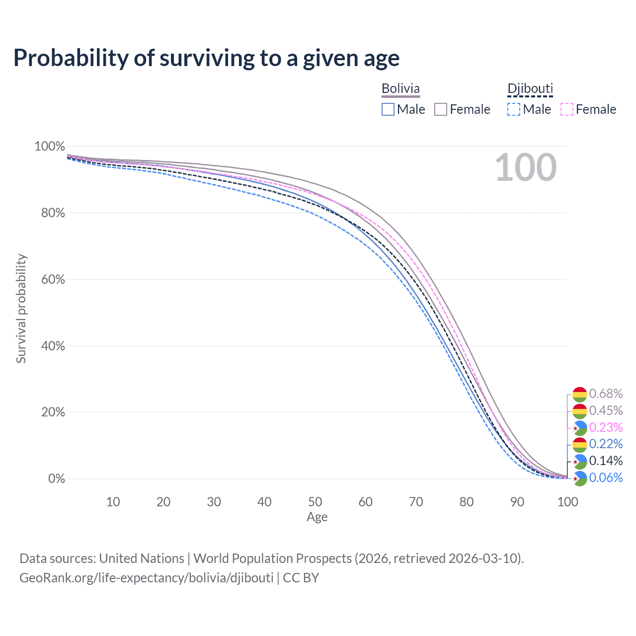 This life expectancy calculator shows the odds of living to 100, 95, 90, and below based on current age for both males and females in Bolivia and Djibouti, along with mean and median age of death. The calculations are based on the 2026 life tables (actuarial tables) from the UN World Population Prospects.