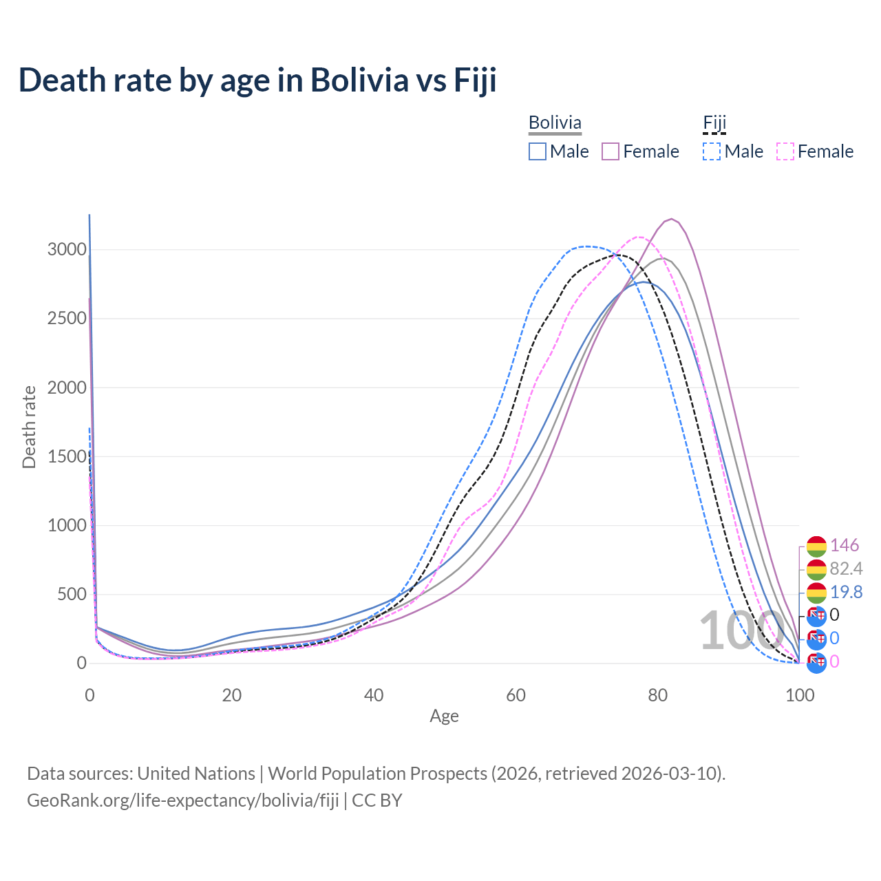 In Bolivia, the most common age of death is 0, compared to 74 in Fiji. The median age of death is 74.5 in Bolivia and 70.5 in Fiji, meaning only half of each cohort is expected to live past that age.