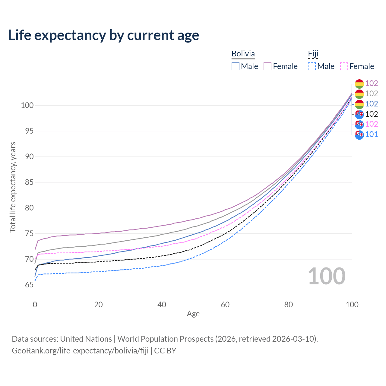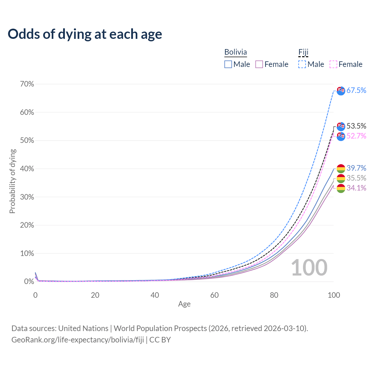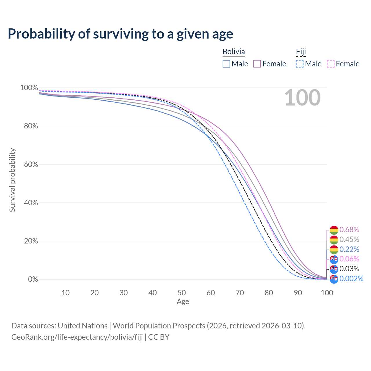 This life expectancy calculator shows the odds of living to 100, 95, 90, and below based on current age for both males and females in Bolivia and Fiji, along with mean and median age of death. The calculations are based on the 2026 life tables (actuarial tables) from the UN World Population Prospects.