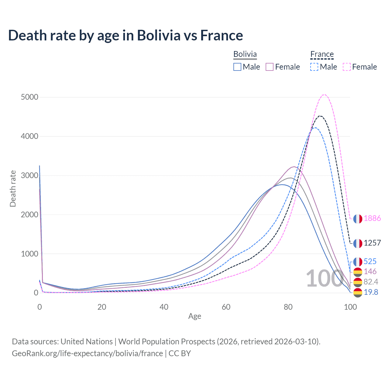 In Bolivia, the most common age of death is 0, compared to 90 in France. The median age of death is 74.5 in Bolivia and 87.4 in France, meaning only half of each cohort is expected to live past that age.
