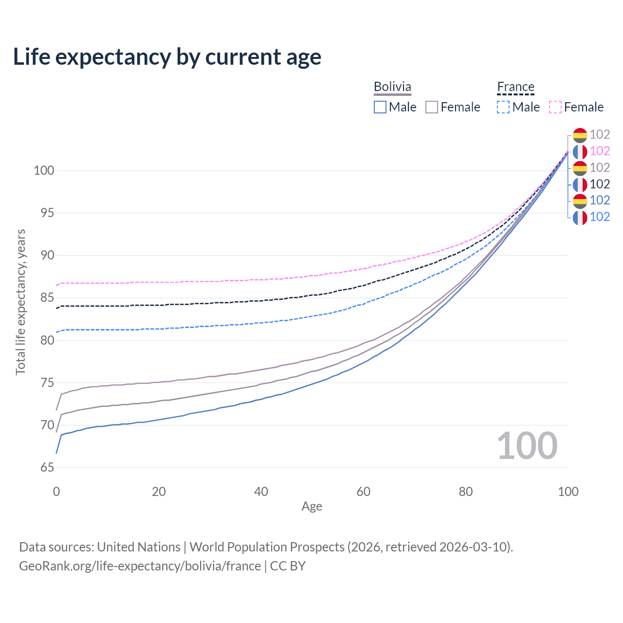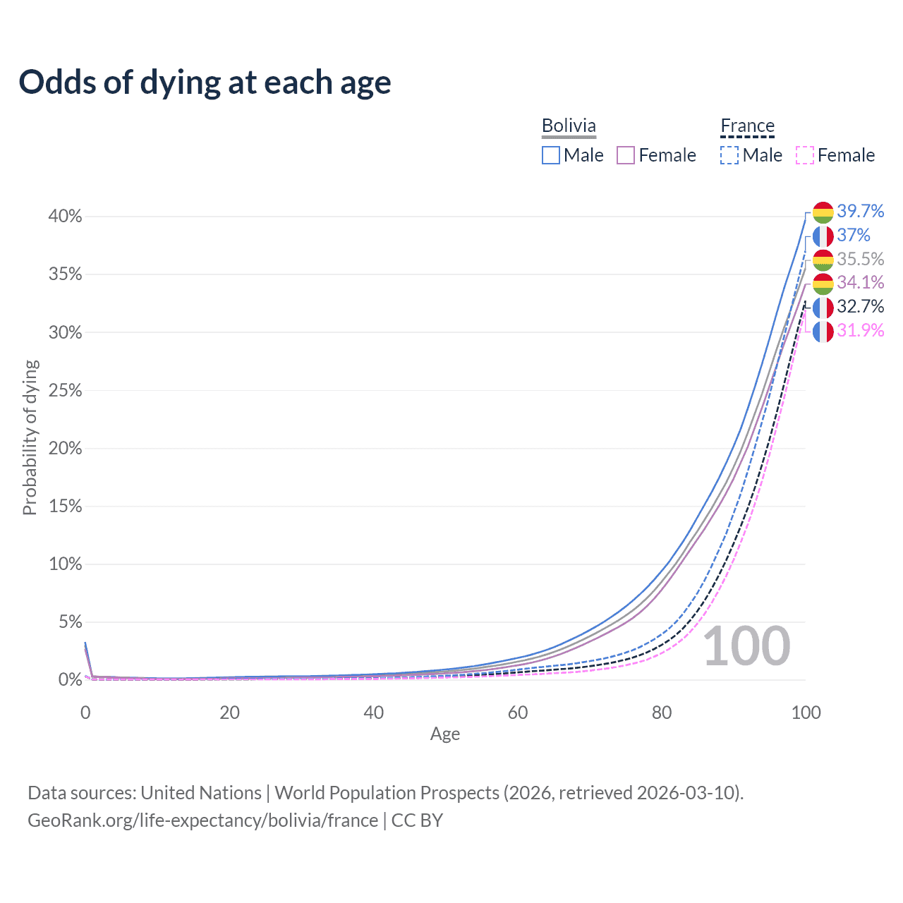 This life expectancy calculator shows the odds of living to 100, 95, 90, and below based on current age for both males and females in Bolivia and France, along with mean and median age of death. The calculations are based on the 2026 life tables (actuarial tables) from the UN World Population Prospects.
