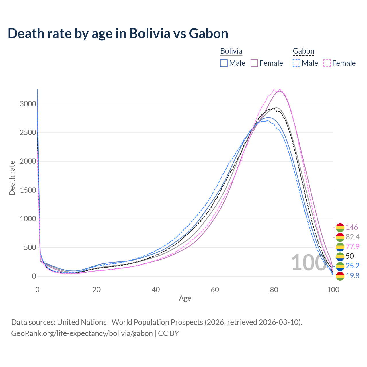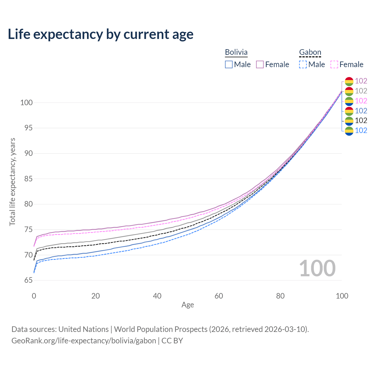 This life expectancy calculator shows the odds of living to 100, 95, 90, and below based on current age for both males and females in Bolivia and Gabon, along with mean and median age of death. The calculations are based on the 2026 life tables (actuarial tables) from the UN World Population Prospects.